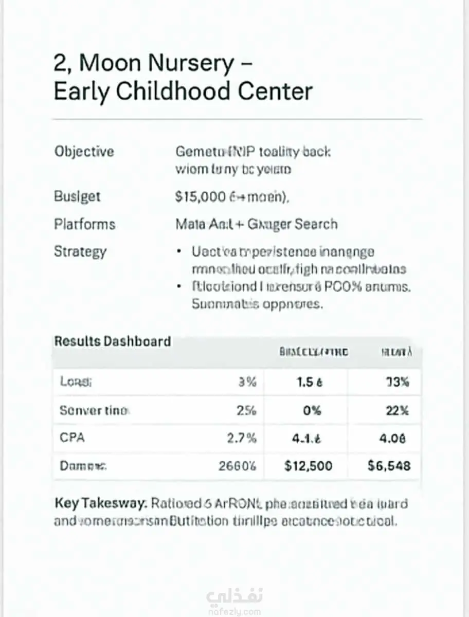 Objective: Generate new nursery registrations. Strategy: Local awareness and lead generation campaigns targeting parents in nearby areas. Results: CPL: 15 EGP Conversion Rate: 35% +180 sign-ups within 2 months.