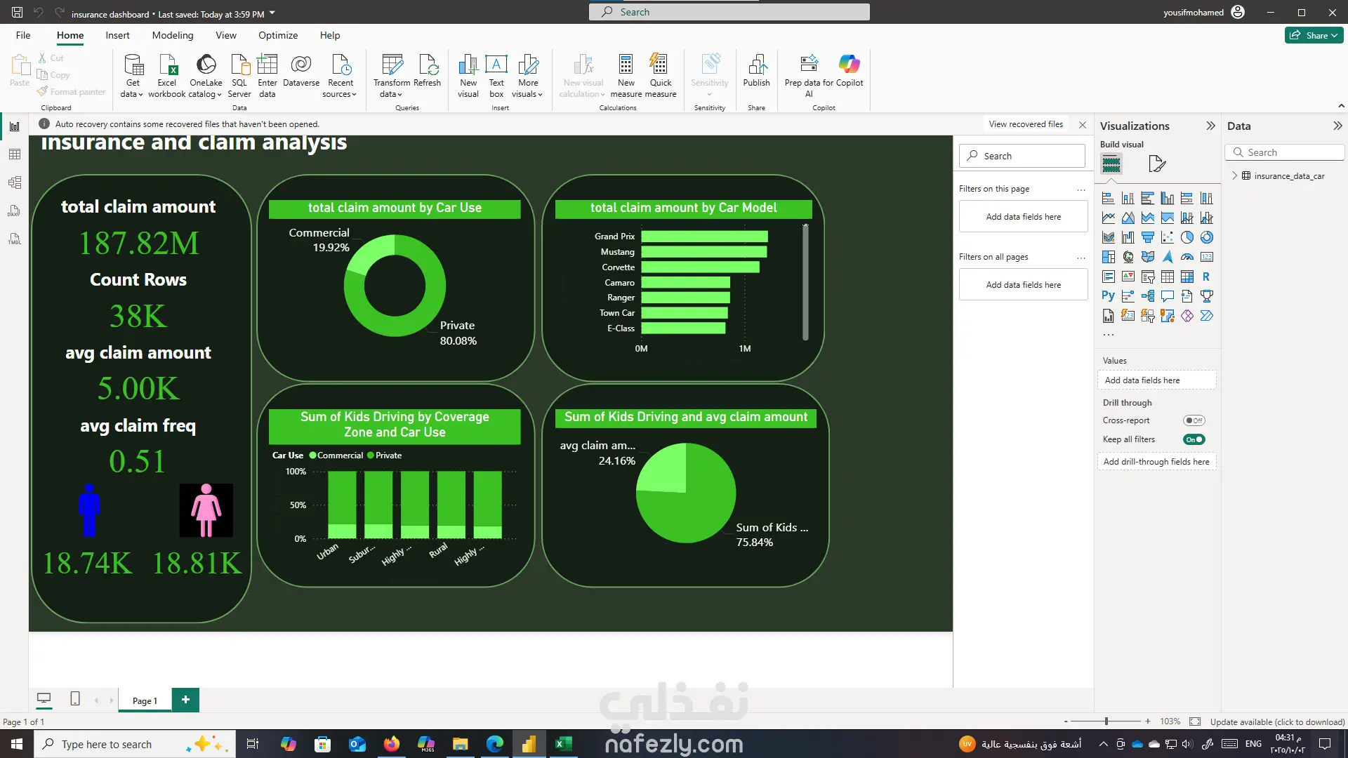 سأقوم بتصميم لوحة تحكم تفاعلية (Dashboard) في Power BI لعرض مؤشرات الأداء الخاصة بالمطالبات التأمينية وتحليلها بشكل شامل ودقيق.