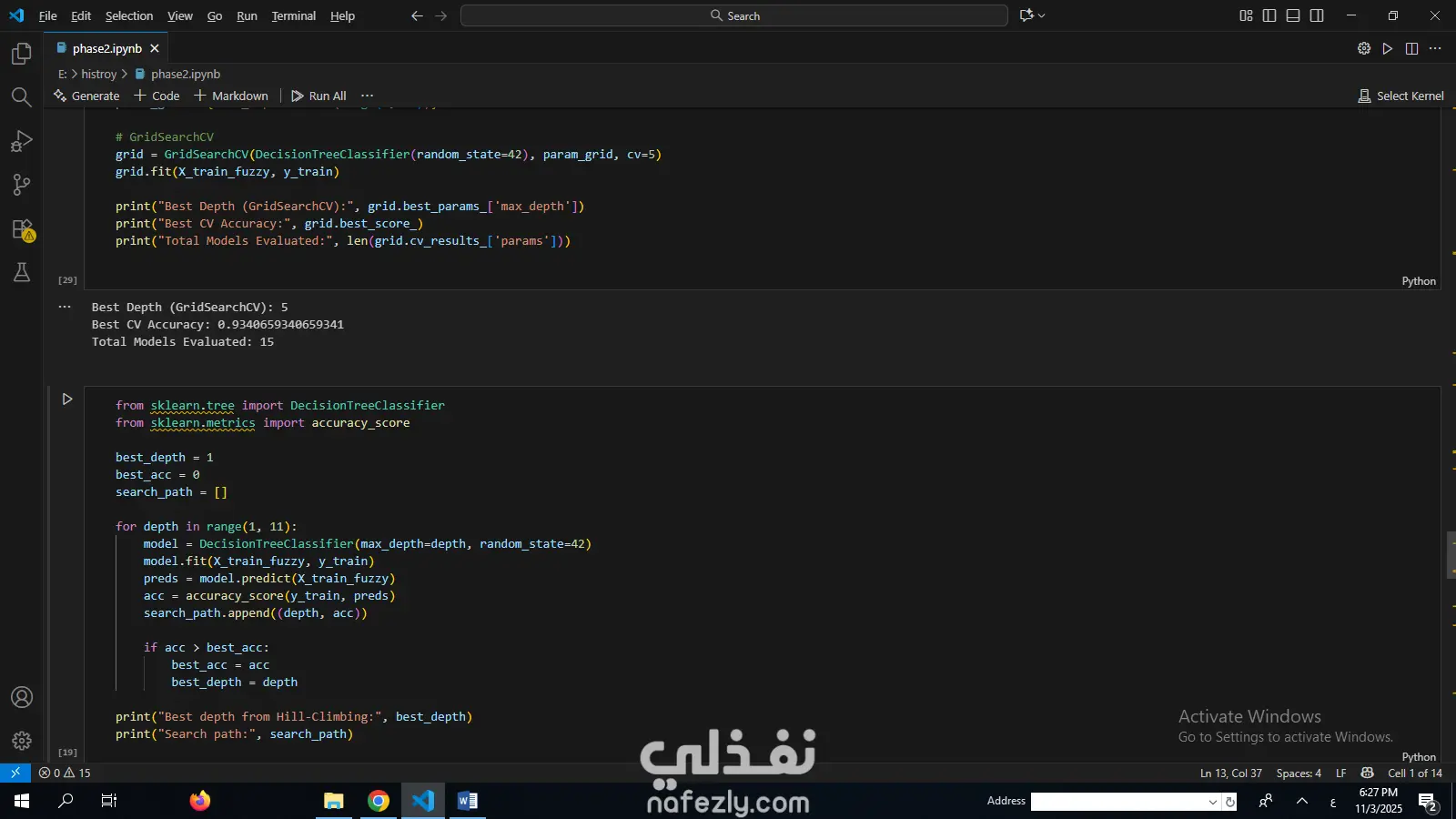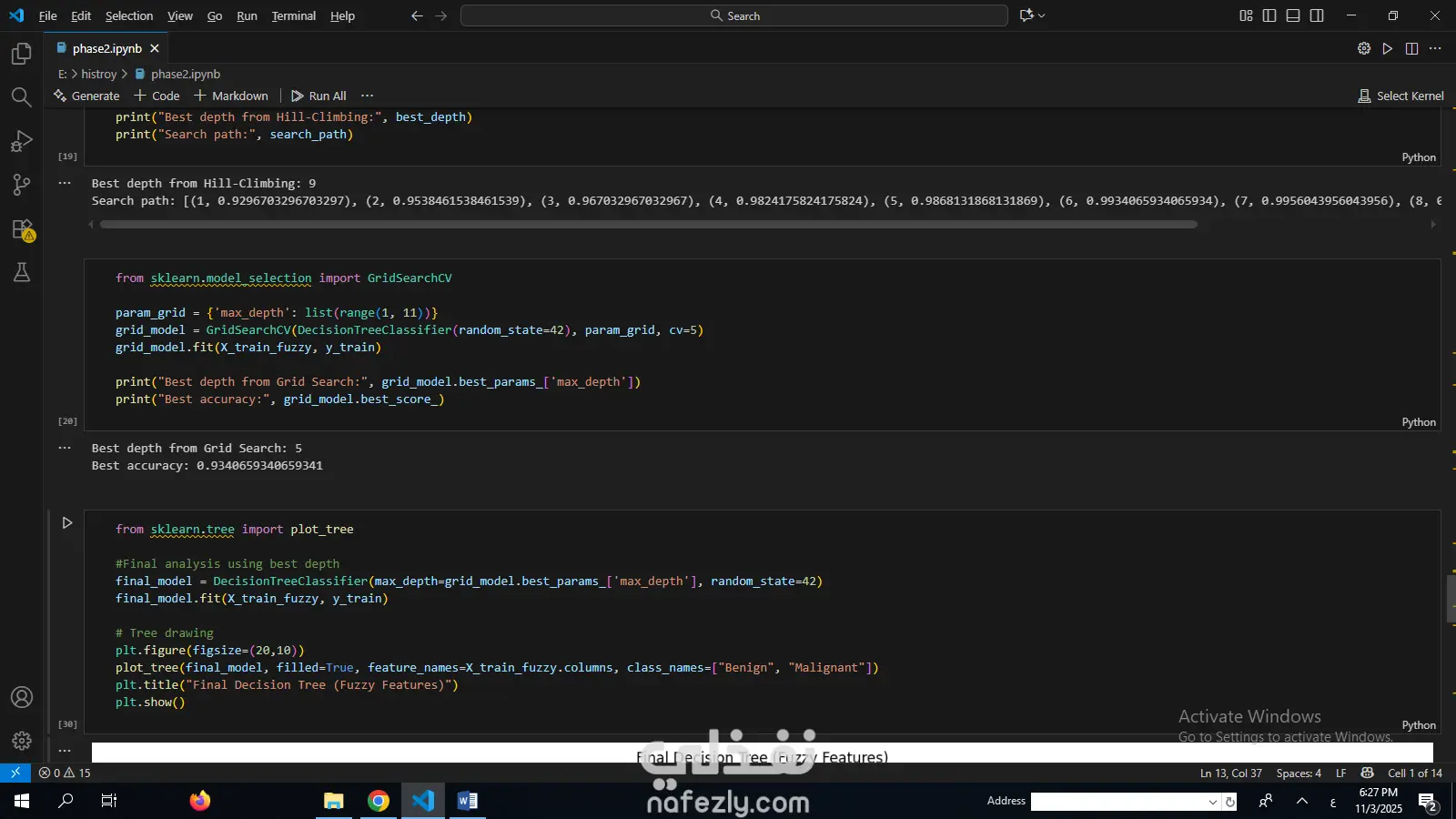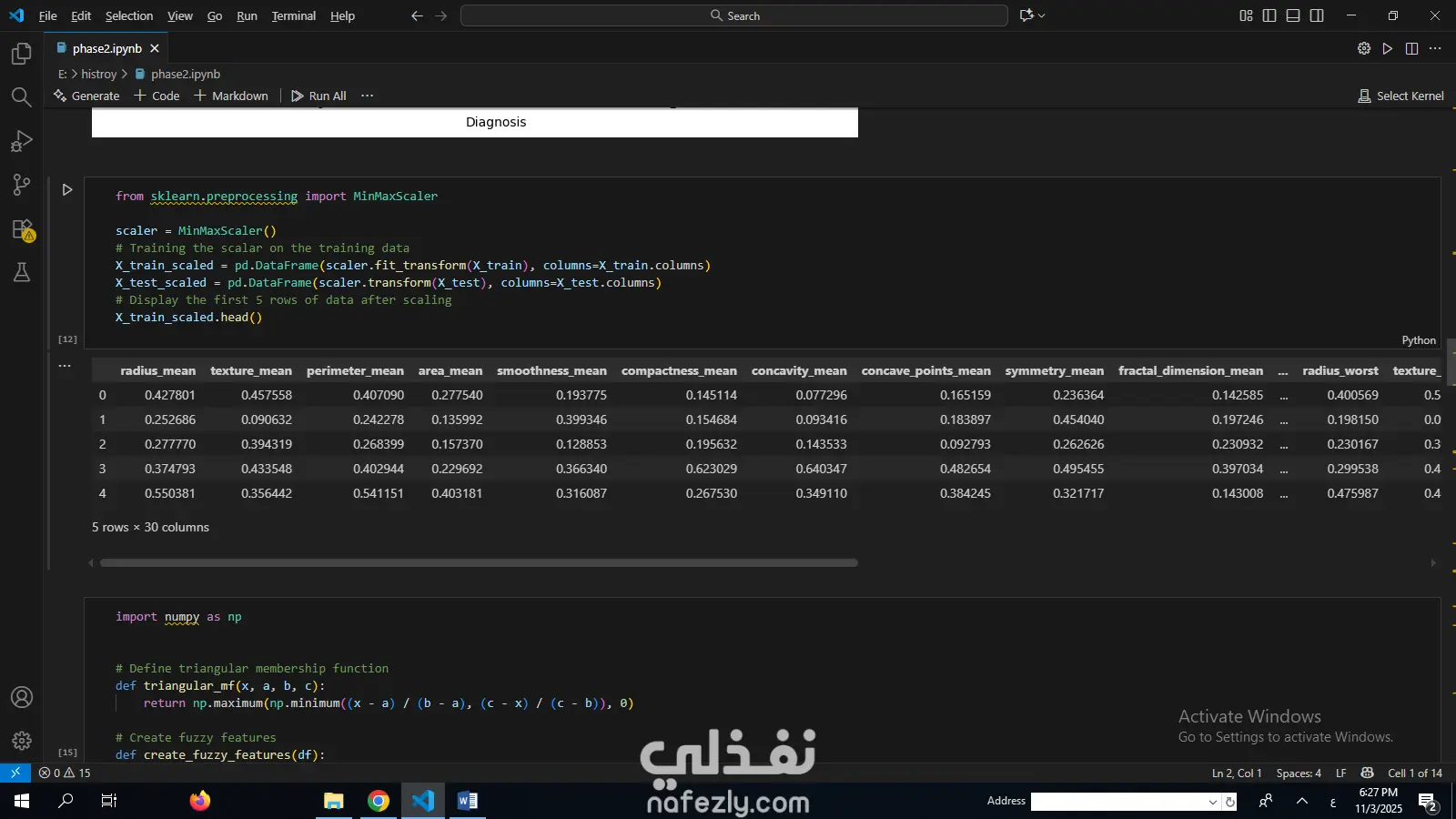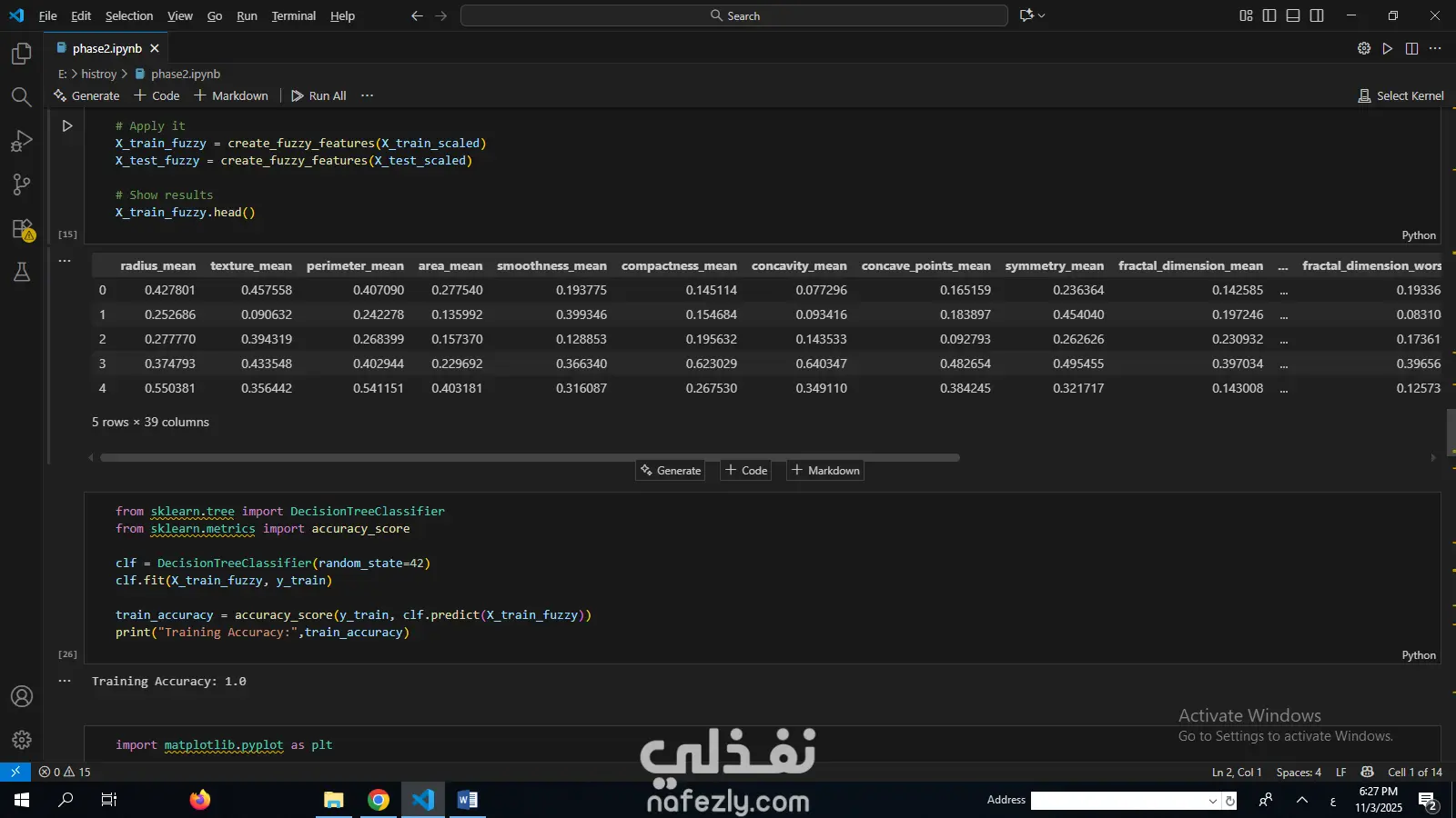 مشروع ذكاء اصطناعي يهدف إلى تشخيص سرطان الثدي باستخدام تقنيات تعلم الآلة (Machine Learning). تم في هذا المشروع استخدام خوارزمية Decision Tree Classifier مع دمج Fuzzy Logic لتحسين دقة النموذج وقدرته على التفسير. يتضمن المشروع جميع مراحل بناء نموذج تعلم الآلة بدءًا من معالجة البيانات وحتى التقييم النهائي، وتشمل الخطوات التالية: تحميل البيانات من مجموعة بيانات سرطان الثدي (Breast Cancer Wisconsin Dataset). تنظيف البيانات بحذف الأعمدة غير المفيدة وتحويل القيم الفئوية إلى رقمية. تجزئة البيانات إلى مجموعة تدريب واختبار بنسبة 80/20. تطبيع الخصائص (Normalization) باستخدام Min-Max Scaler. تطبيق Fuzzy Logic عبر إنشاء ميزات ضبابية (Fuzzy Features) لخصائص radius، area، وtexture. تدريب نموذج Decision Tree على البيانات الجديدة بعد التحويل الضبابي. تحسين الأداء باستخدام طريقتي Hill-Climbing وGrid Search لاختيار أفضل عمق للشجرة. تقييم النموذج من خلال مصفوفة الالتباس (Confusion Matrix) وتقرير التصنيف (Classification Report). عرض النتائج بشكل بصري باستخدام الرسوم البيانية وشجرة القرار لتوضيح كيفية اتخاذ القرارات. 🎯 النتيجة النهائية: نموذج دقيق وقابل للتفسير يساعد في دعم القرار الطبي وتشخيص سرطان الثدي بشكل أفضل من خلال الدمج بين الذكاء الاصطناعي والمنطق الغامض (Fuzzy Logic).