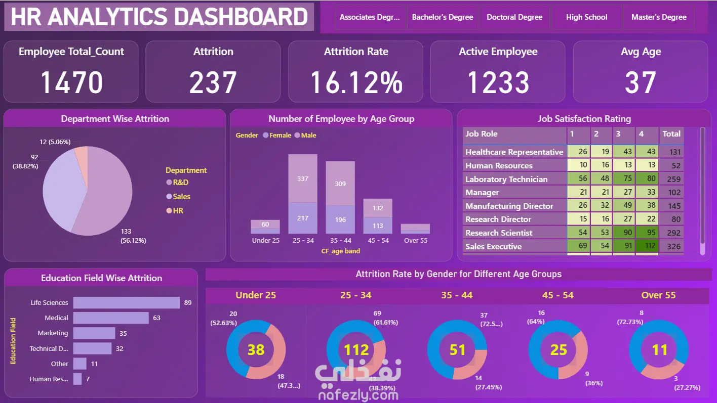 قمت بتصميم لوحات معلومات تفاعلية باستخدام Power BI لتحليل بيانات الموارد البشرية، بهدف تحويل البيانات إلى رؤى واضحة تساعد في تتبع الأداء واتخاذ قرارات دقيقة وسريعة.