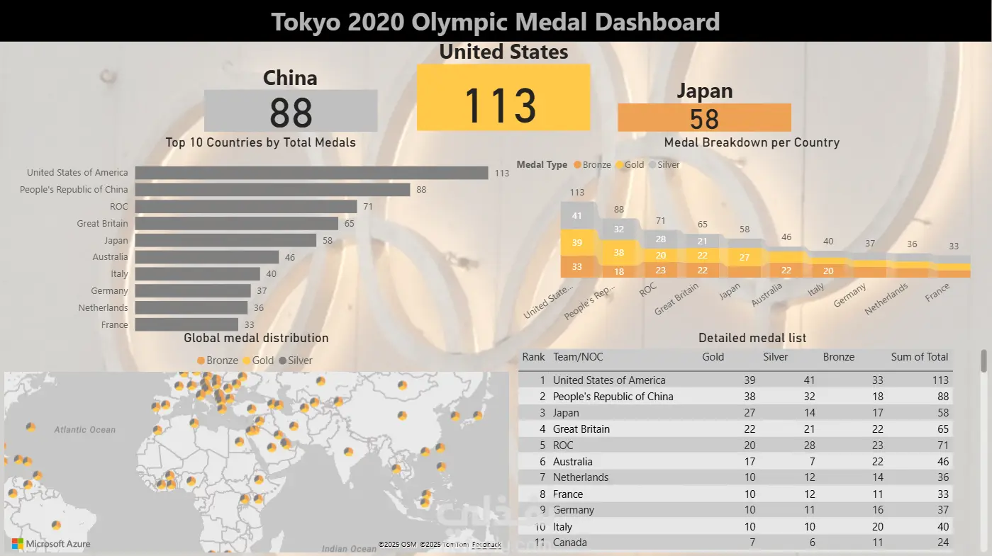 في هذا المشروع، قمتُ بتصميم لوحة تفاعلية متكاملة داخل Power BI لعرض وتحليل بيانات أولمبياد طوكيو.