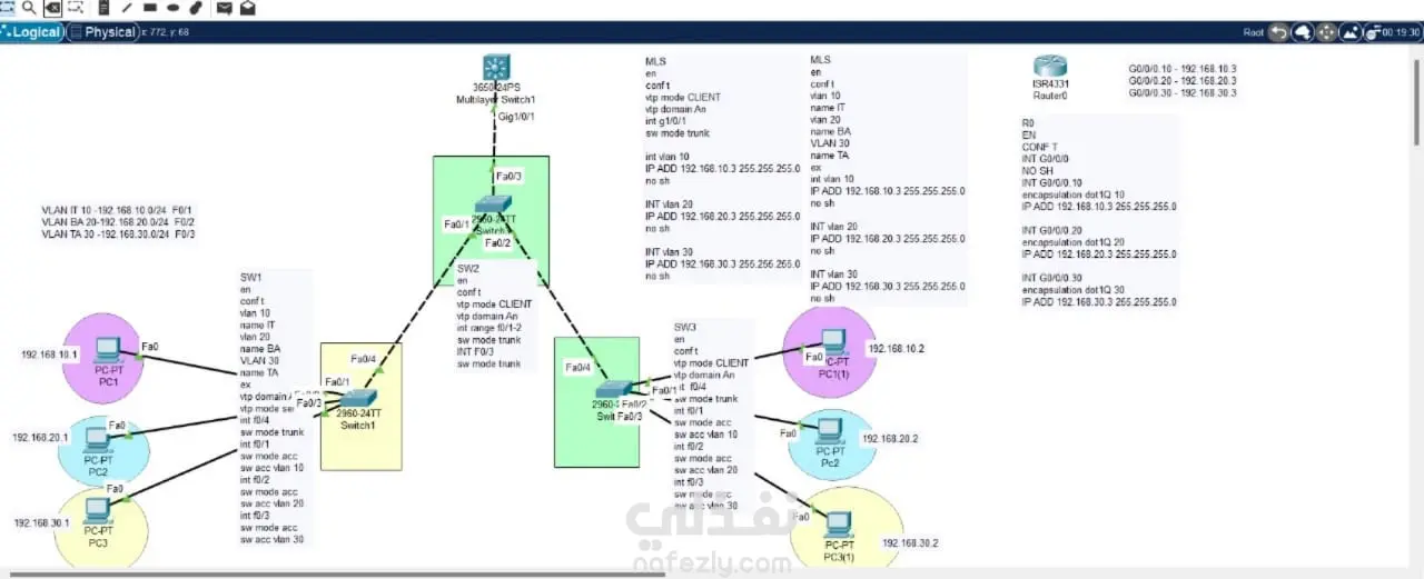 قمت بتصميم وتنفيذ شبكة بنظام switch virtiual interface لتفعيل الاتصال بين عدة VLANs من خلال راوتر واحد متصل بسويتش يدعم الـTrunk Port.تم إعداد الراوتر لتقسيم الشبكة إلى عدة VLANs وتكوين Sub-Interfaces لكل شبكة فرعية مع عناوين IP مخصصة.بعد الانتهاء من الإعداد، تم اختبار الاتصال بين جميع الـVLANs للتأكد من أنها تتواصل بشكل صحيح (Inter-VLAN Communication) دون أي فقد في البيانات، مع توثيق الخطوات والإعدادات لضمان سهولة الفهم والتطبيق مستقبلاً.