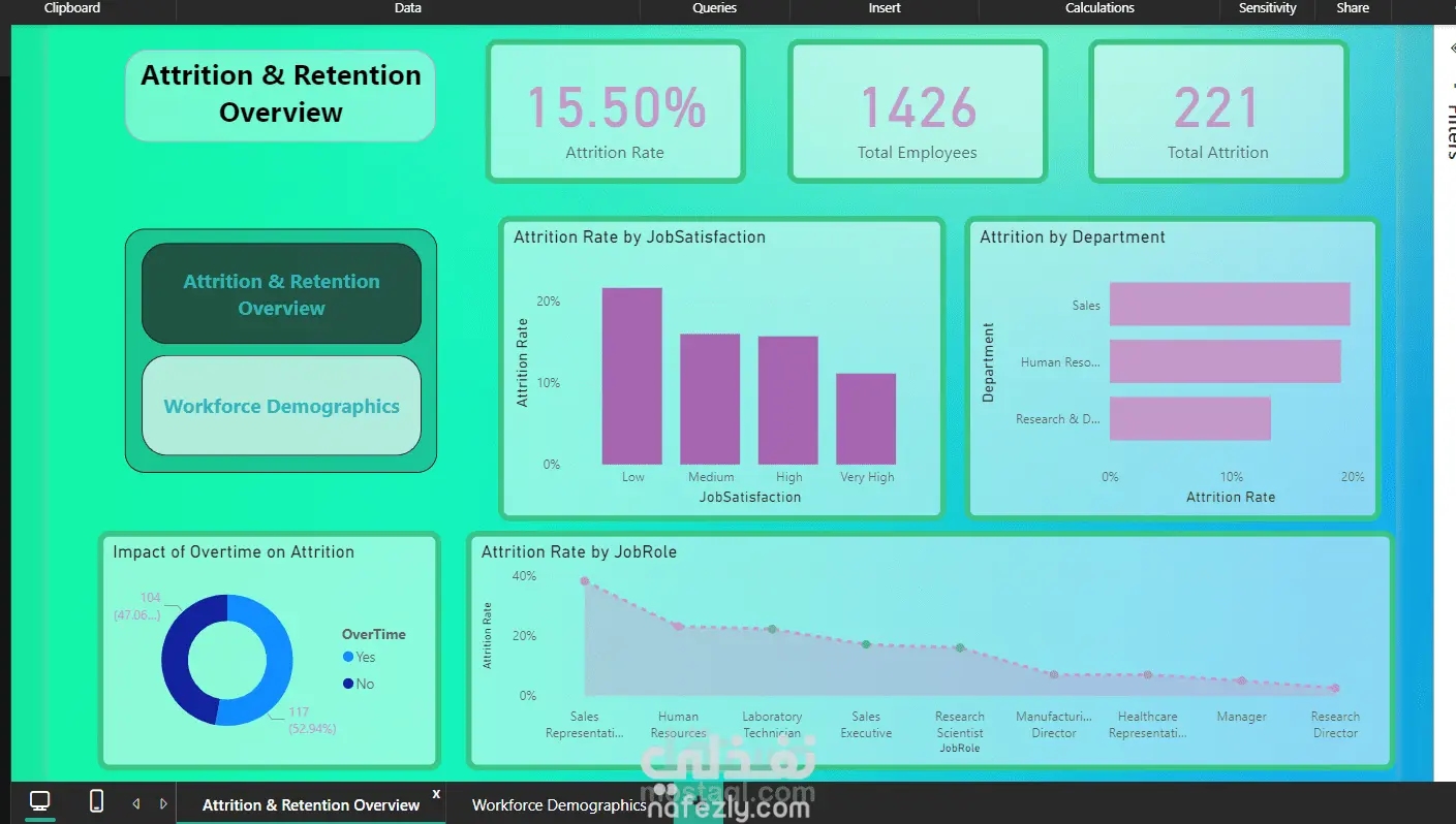 تم تصميم لوحة مؤشرات (Dashboard) تفاعلية متكاملة في Power BI لعرض وتحليل بيانات الموارد البشرية (HR Analytics). تعرض اللوحة مجموعة من مؤشرات الأداء الرئيسية (HR KPIs) بشكل مرئي ومنظم يساعد في اتخاذ القرارات. أهم المؤشرات المعروضة: معدل دوران الموظفين (Attrition Rate) إجمالي عدد الموظفين (Total Employees) عدد حالات الانفصال (Total Attrition) معدل الاستبقاء حسب الرضا الوظيفي، القسم، والدور الوظيفي ساعات العمل الإضافية وتأثيرها على معدل الدوران توزيع الموظفين حسب الجنس والعمر والدور الوظيفي متوسط الدخل الشهري حسب الدور توزيع الموظفين حسب الأقسام المميزات: تصميم جذاب بالألوان والعناصر البصرية الاحترافية. إمكانية التنقل بين الشاشات (Attrition & Retention – Workforce Demographics). التحديث الديناميكي للبيانات من ملفات Excel. عرض شامل وسهل القراءة لمؤشرات الأداء الرئيسية.