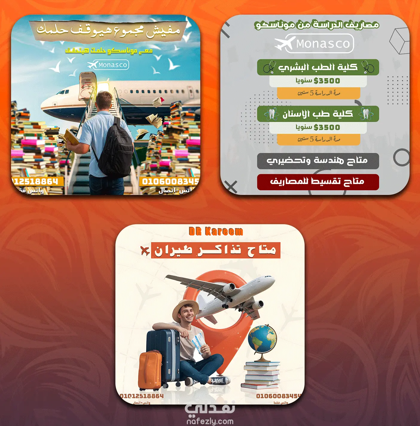 قدّمت تصاميم احترافية موجهة لشركات تحويل الأموال والسفر مثل موناسكو، تعكس الثقة والمصداقية وتظهر الخدمات المالية بشكل أنيق وواضح. أصمم منشورات، بوسترات، وبنرات ترويجية متوافقة مع الهوية البصرية للشركة.