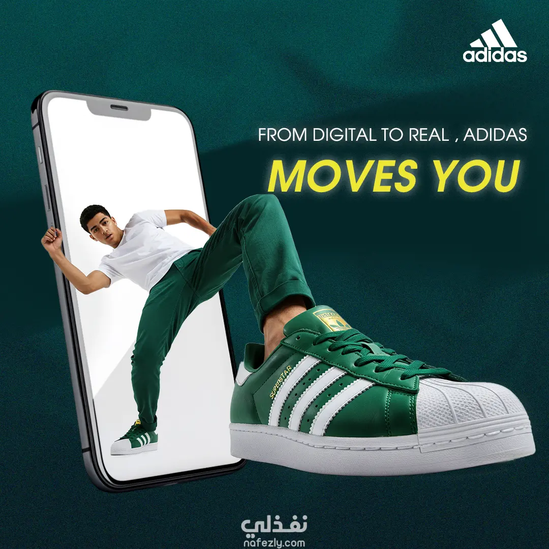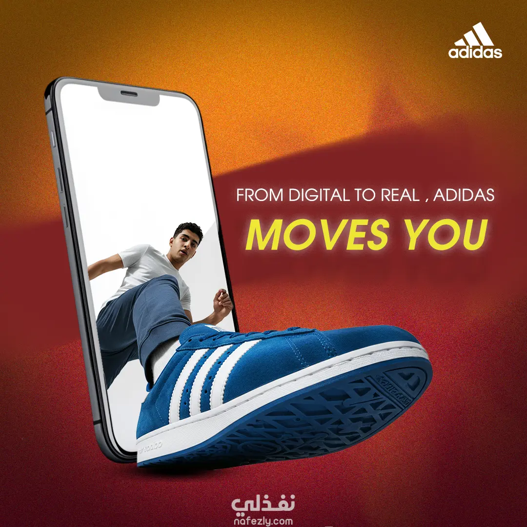 تصميم سوشيال ميديا بماقاسات 1080*1080 باستخدام photoshope عبارة عن احمله اعلانيه وهميه لحذاء اديدساس