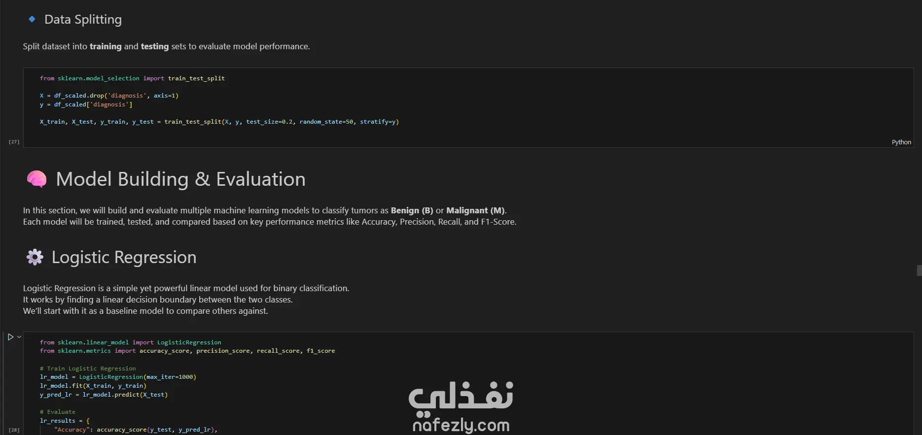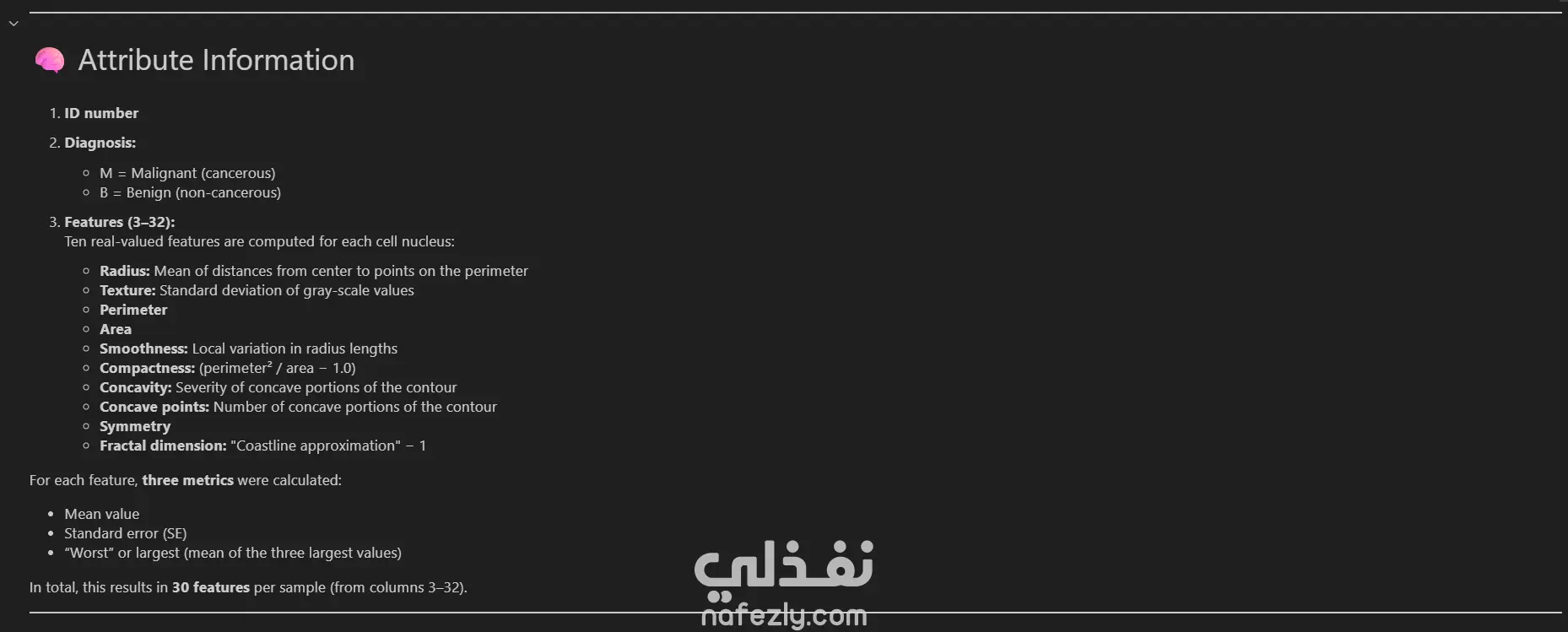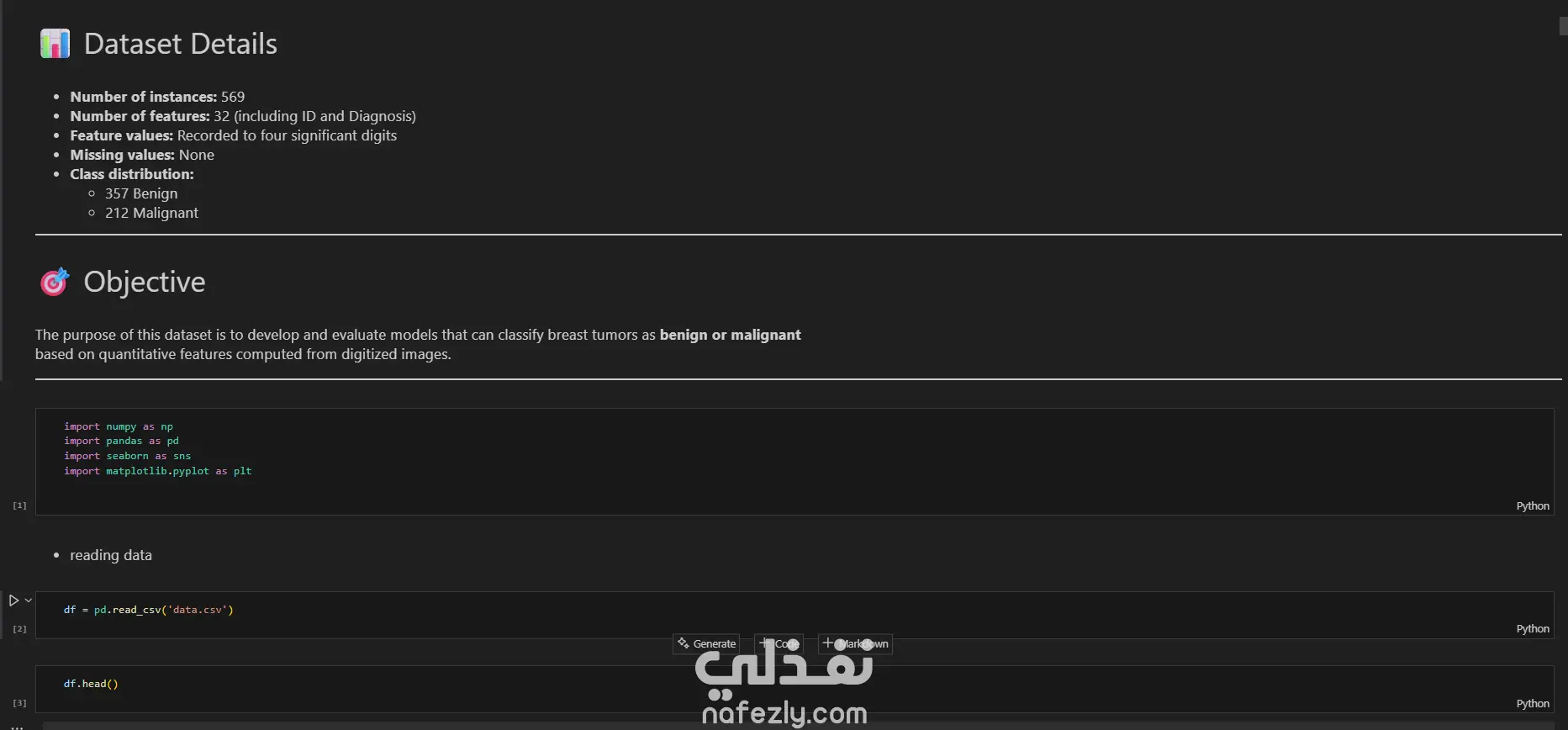 مشروع تحليل بيانات سرطان الثدي وبناء نموذج ذكاء اصطناعي للتنبؤ بالحالة (Benign / Malignant) باستخدام تقنيات تحليل البيانات (EDA) وخوارزميات التعلم الآلي (Machine Learning). يشمل المشروع تنظيف البيانات، استكشاف العلاقات الإحصائية، اختيار الخصائص المؤثرة، تدريب عدة نماذج، والمقارنة بينهم لاختيار الأفضل من حيث الأداء.
