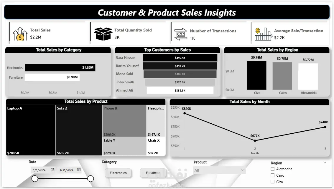 - فلاتر للتصفية حسب التاريخ، الفئة، المنتج، والمنطقة.