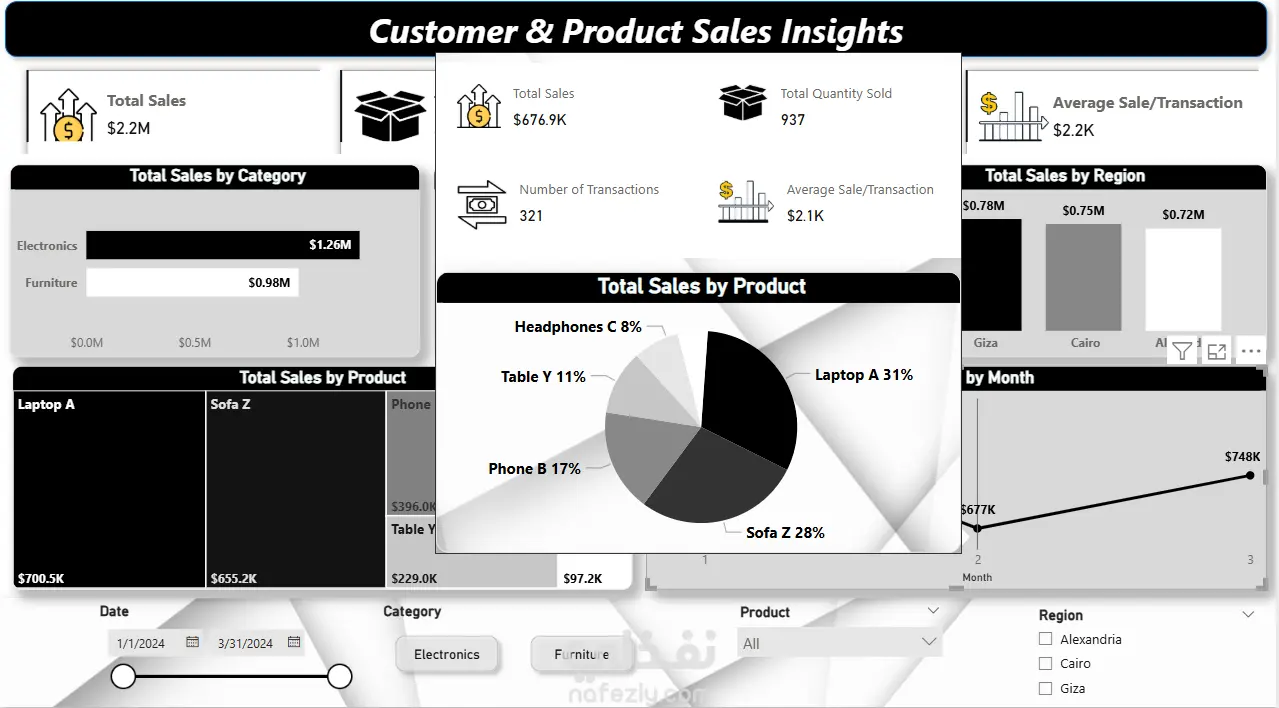 - صفحات توضيحية (Tooltip) لمزيد من التفاصيل حسب المنطقة، العميل، الفئة، والشهر.
