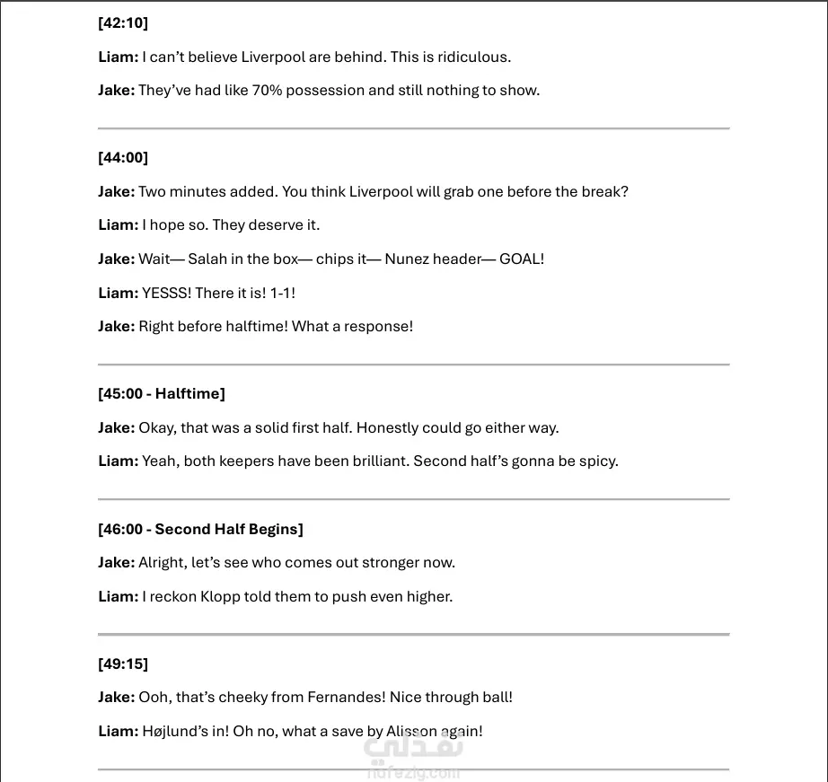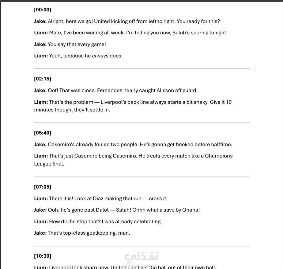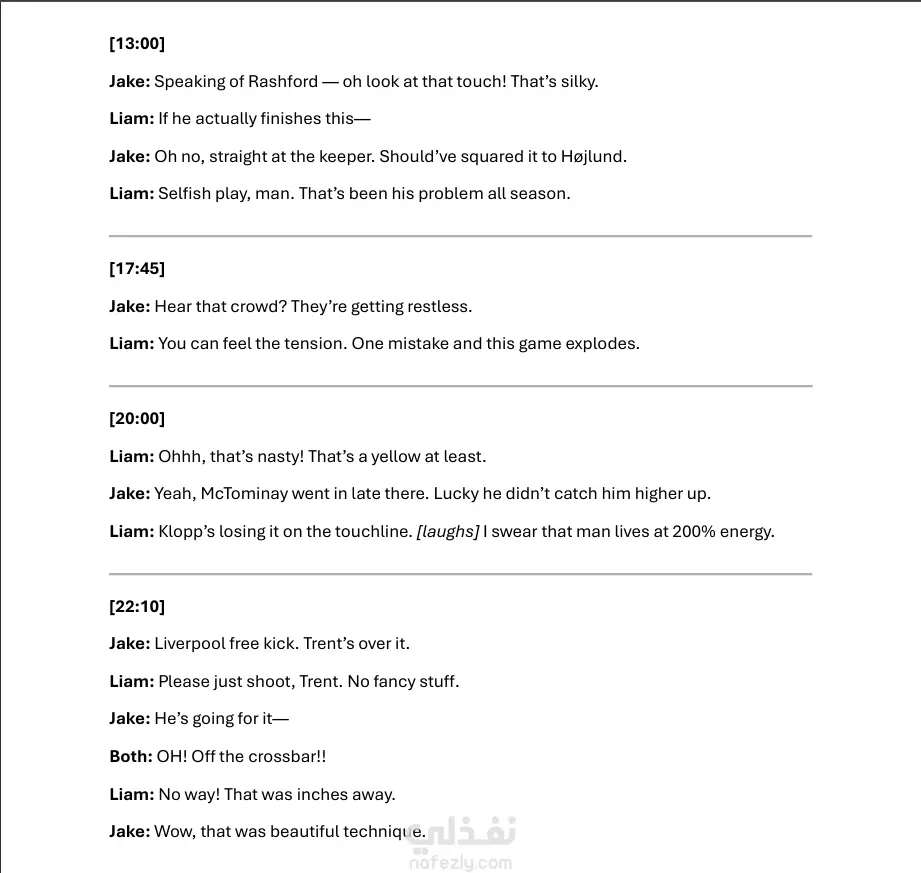 تفريغ صوتي للقاء بين مذيع و صديقه في بودكاست خاص بكرة القدم و كانوا يشاهدون المباراة و يعلقون