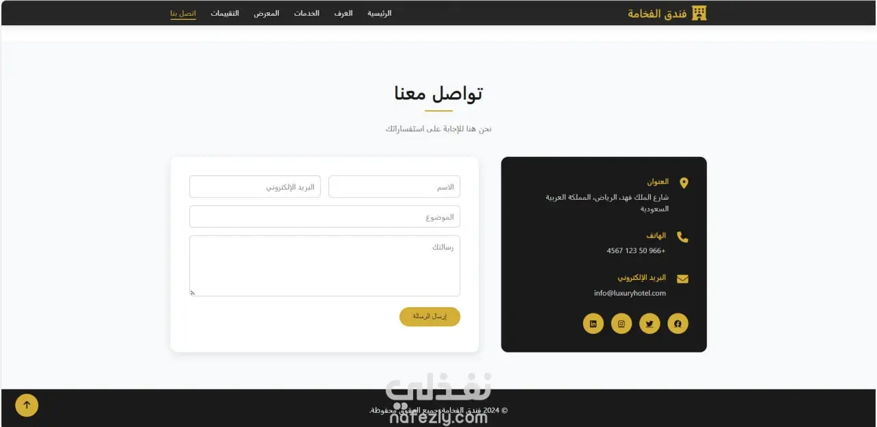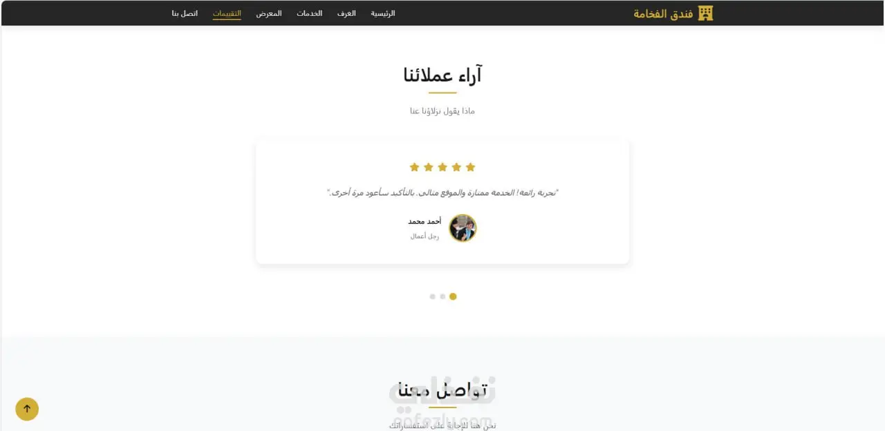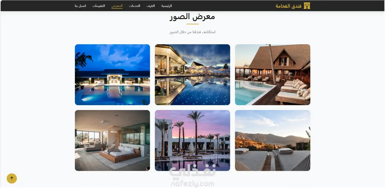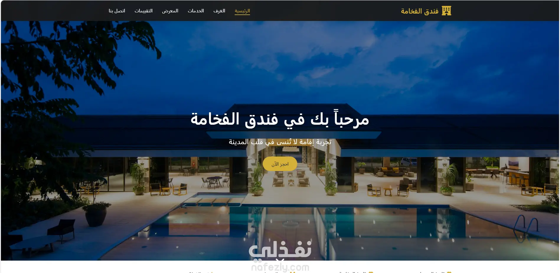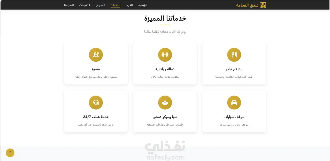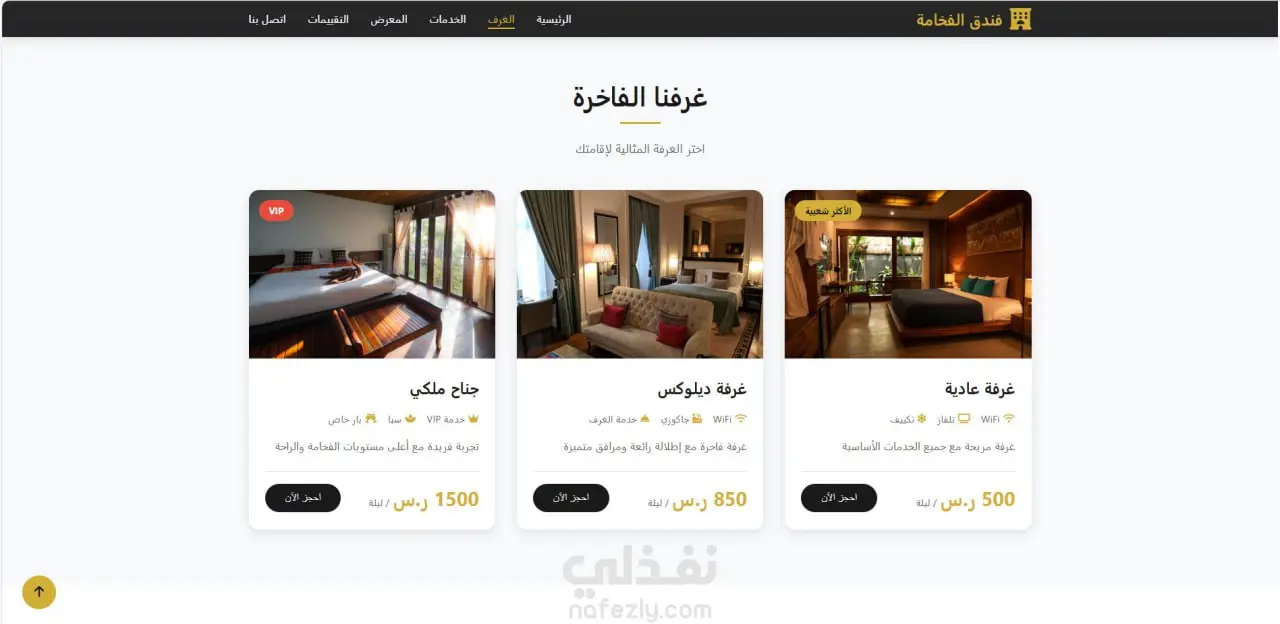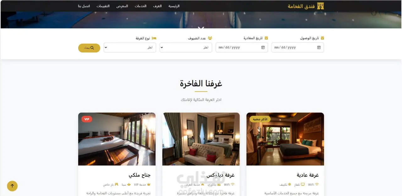 🎯 المميزات الرئيسية: ✨ التصميم تصميم عصري واحترافي متجاوب تماماً مع جميع الأجهزة ألوان فاخرة ومتناسقة (ذهبي وأسود) تأثيرات حركية سلسة 📱 الأقسام شريط التنقل - ثابت مع تأثيرات الصفحة الرئيسية - صورة بانورامية جذابة نموذج الحجز السريع - سهل الاستخدام الغرف - 3 أنواع مع الأسعار الخدمات - 6 خدمات مميزة المعرض - صور تفاعلية التقييمات - slider متحرك التواصل - نموذج ومعلومات ⚡️ JavaScript قائمة متحركة للموبايل Smooth scrolling Gallery lightbox Reviews slider Form validation Scroll animations زر العودة للأعلى 🎨 تحسينات إضافية يمكنك إضافة: نظام حجز حقيقي تكامل مع API الدفع لغات متعددة خريطة تفاعلية مع تقييمات الذبائن