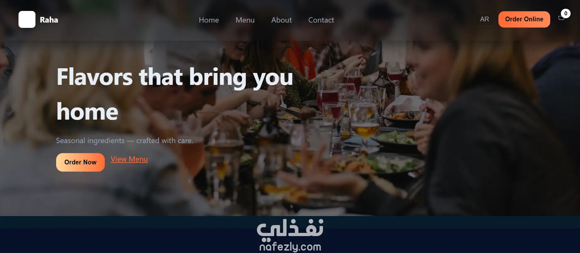 صفحة رئيسية جذابة تعرض نبذة عن المطعم وصور الأطباق المميزة.