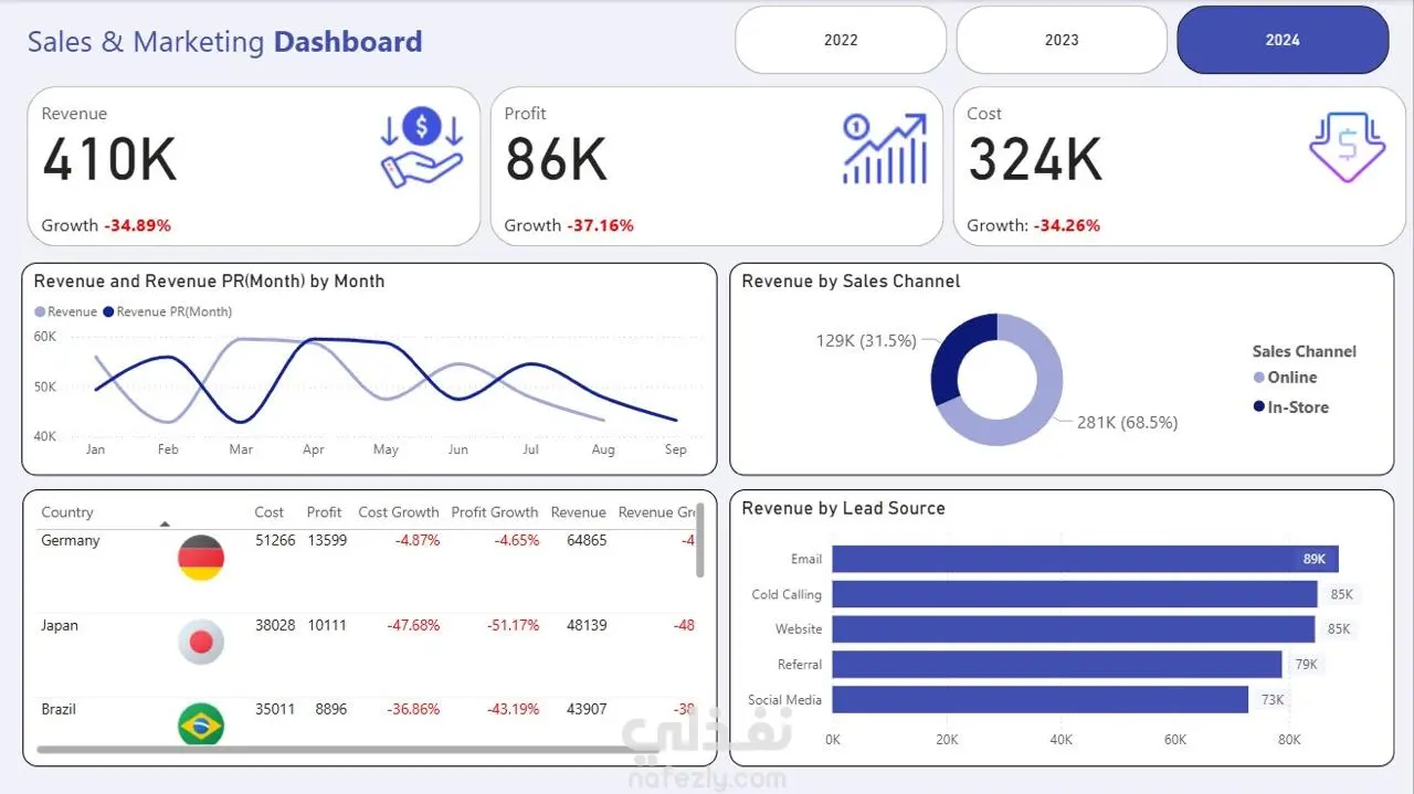 • تحليل الإيرادات حسب القنوات (Online / In-Store) ومصادر العملاء (Website، Email، Social Media، Referral، Cold Calling)
