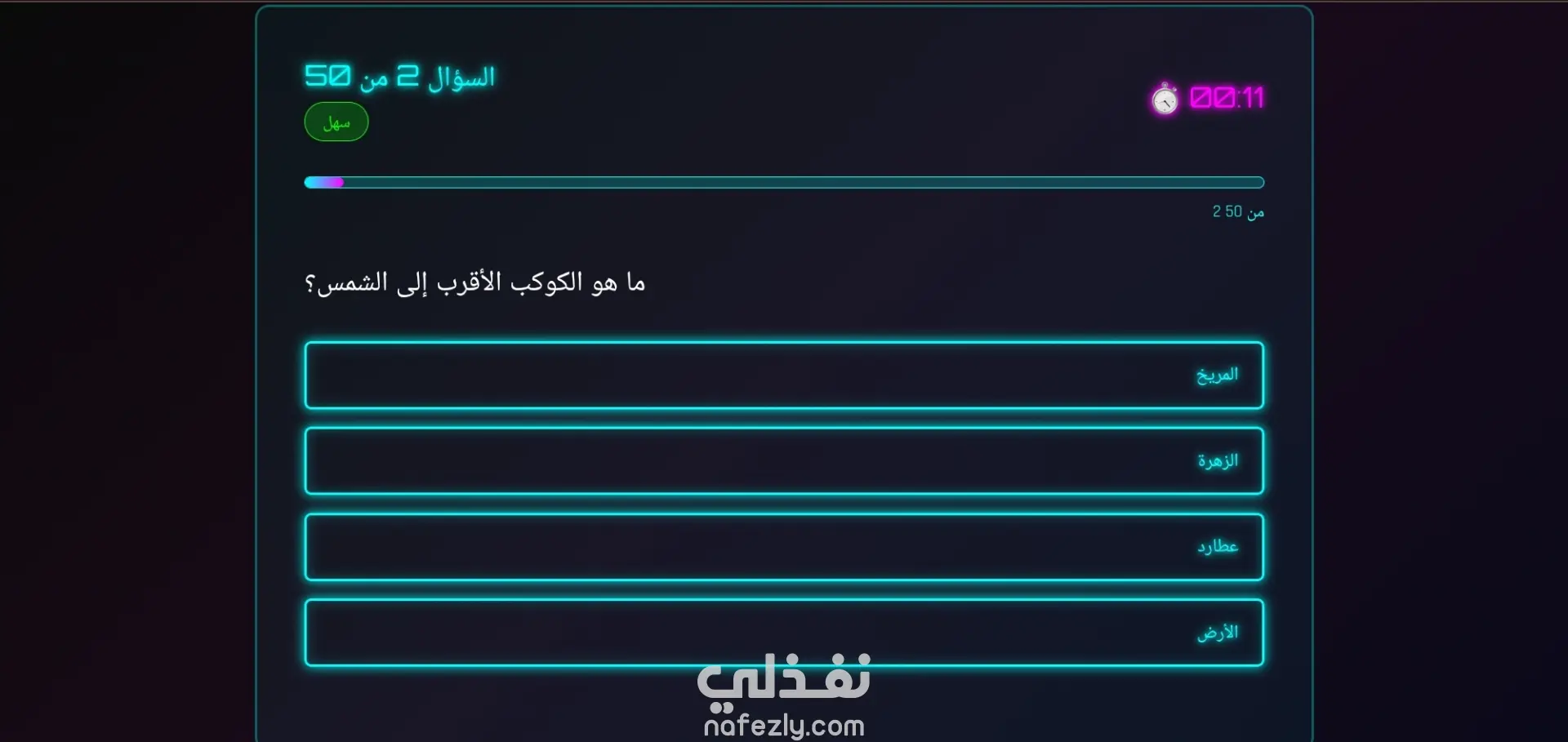 موقع إلكتروني للأسئلة غي مجالاتمتنوعة بين الختيار من متعدد و الصواب والخطأ مع إمكانية الوقت أو لا