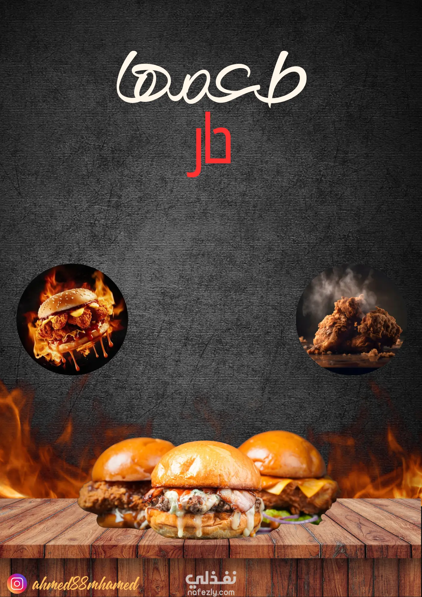 تصميم إعلان احترافي لمطعم وجبات سريعة يعتمد على الجاذبية البصرية والهوية النارية القوية للمحتوى، حيث يظهر في التصميم شعار جذاب بكلمة "طعمتها نار" بخط مميز يعكس الطابع الحار للوجبات المقدمة. يحتوي التصميم على صور واقعية عالية الجودة لبرغر ودجاج مقلي مع تأثيرات النار والدخان لإبراز النكهة الحارة والمذاق القوي. تم استخدام خلفية داكنة وملمس خشن لإبراز العناصر البصرية وإعطاء الإحساس بالقوة والحرارة. كما تم دمج عناصر اللهب والخشب لإضافة طابع الشواء والدفء