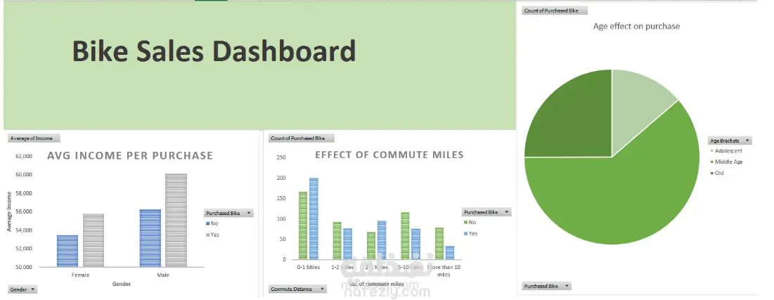 تحليل مبيعات الدراجات بالنسبة إلى الدخل والنوع، مسافة الوصول للعمل, والمرحلة العمرية باستخدام اكسيل.