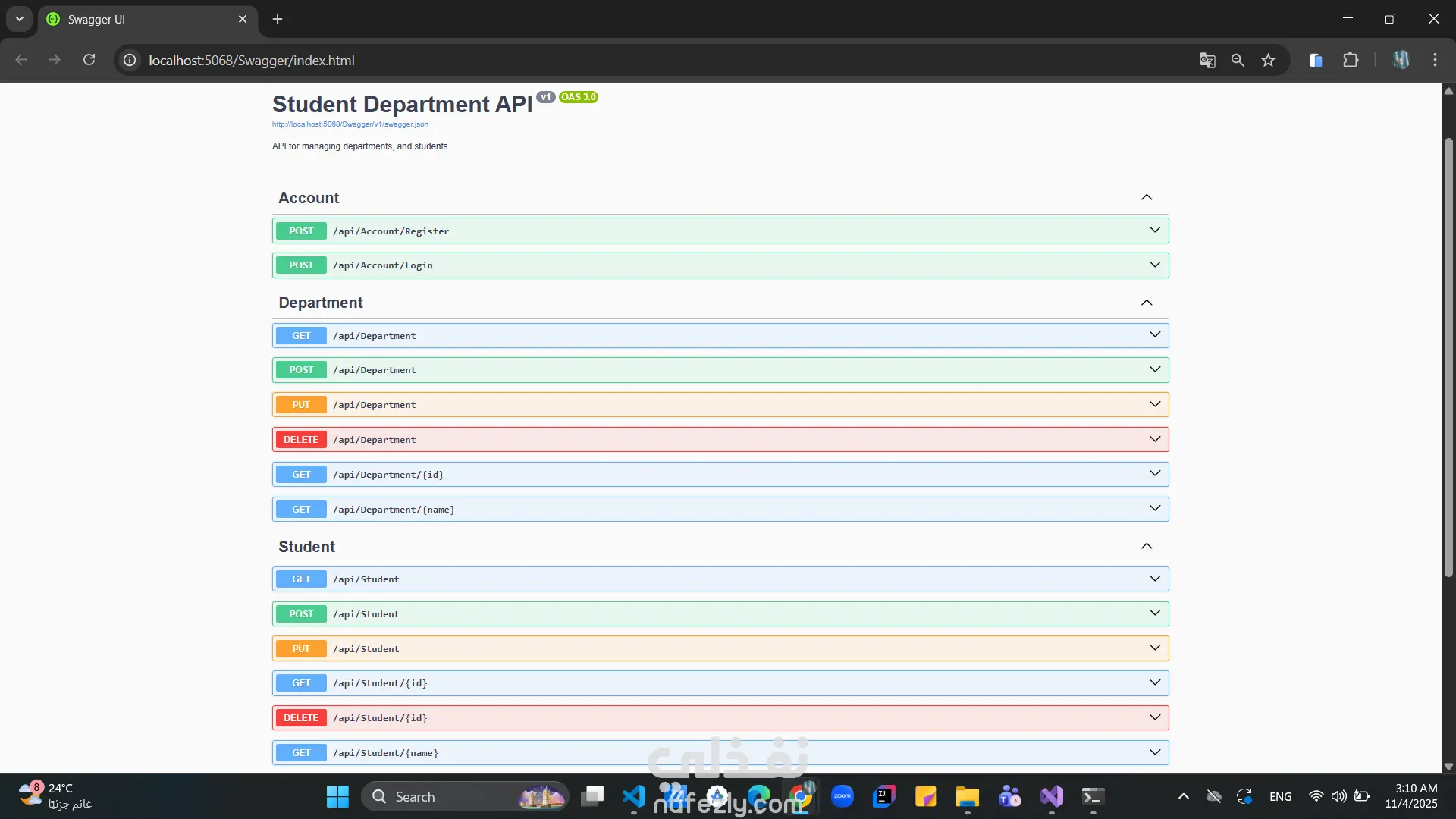 مشروع CRUD متكامل لإدارة الطلاب والأقسام الجامعية باستخدام ASP.NET Core وC#، يشمل: إدارة البيانات: إضافة، تعديل، حذف، واسترجاع بيانات الطلاب والأقسام. استخدام DTOs لتنظيم عرض البيانات. ربط الطلاب بالأقسام باستخدام علاقات قاعدة البيانات (Entity Framework Core). واجهة API كاملة للطلاب والأقسام مع دعم استعلامات GET/POST/PUT/DELETE. واجهة ويب تفاعلية لعرض بيانات الطلاب في جدول باستخدام HTML وBootstrap وJavaScript (بدون jQuery). تطبيق CORS لتحديد الوصول إلى الـ API. عرض رسائل خطأ ومعلومات التحميل بطريقة تفاعلية. إمكانية تطوير المشروع لاحقًا لإضافة Authentication باستخدام JWT.