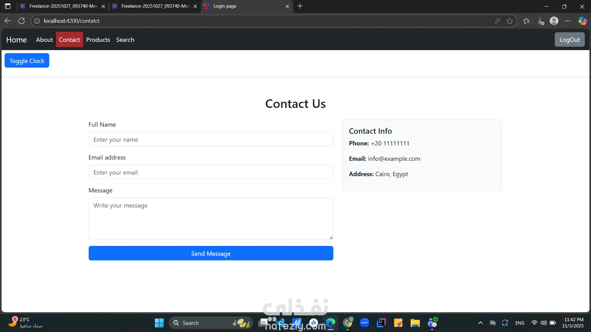 -هذا مشروع تطبيق Angular جاهز لإدارة عربة التسوق والمنتجات. المشروع مثالي للتعلم العملي أو الاستخدام الفوري، ويحتوي على: المميزات: عرض قائمة المنتجات والتفاصيل لكل منتج. البحث والفلترة بالاسم. التنقل بين الصفحات باستخدام Angular Routing (Home، About، Contact، Products، Product Details). عرض الوقت الحالي باستخدام مكون ساعة مخصص. Parent–Child Communication بين المكونات (@Input() و @Output()). إدارة المنتجات عبر ProductsService (بحث حسب الفئة أو ID). تطبيق Lifecycle Hooks (ngOnInit, ngOnDestroy). استخدام Dependency Injection بطريقتين: constructor و inject().
