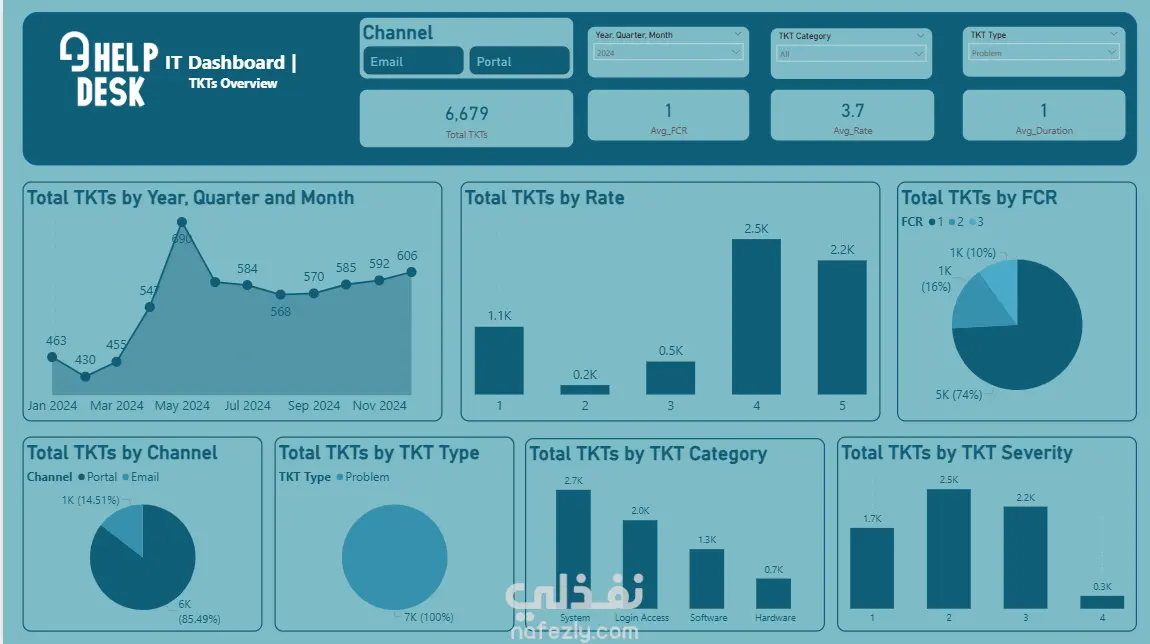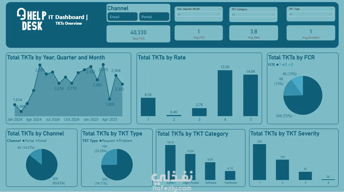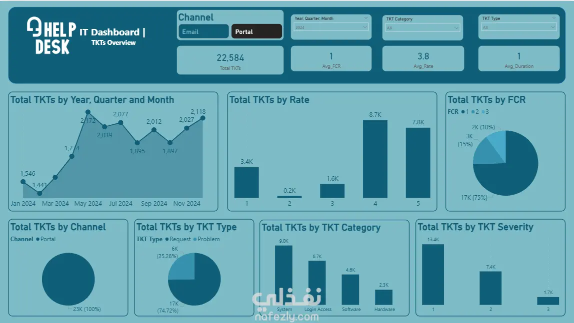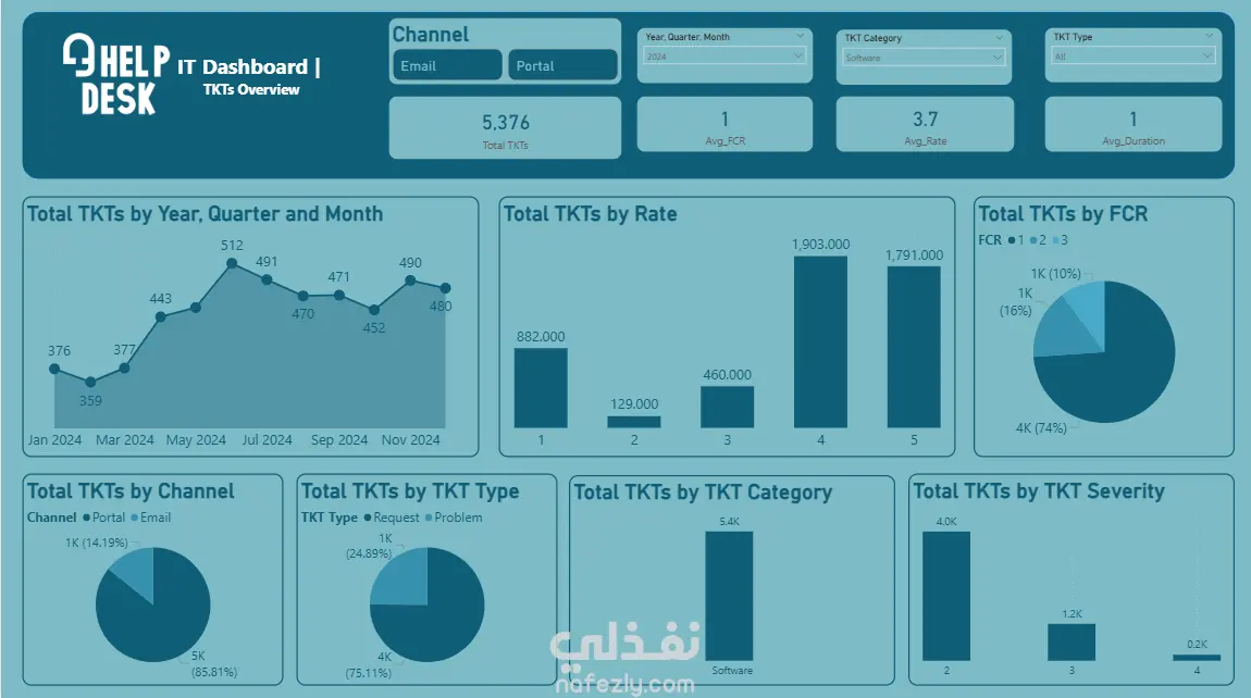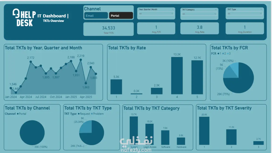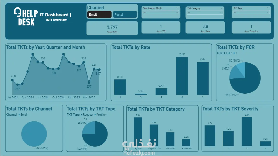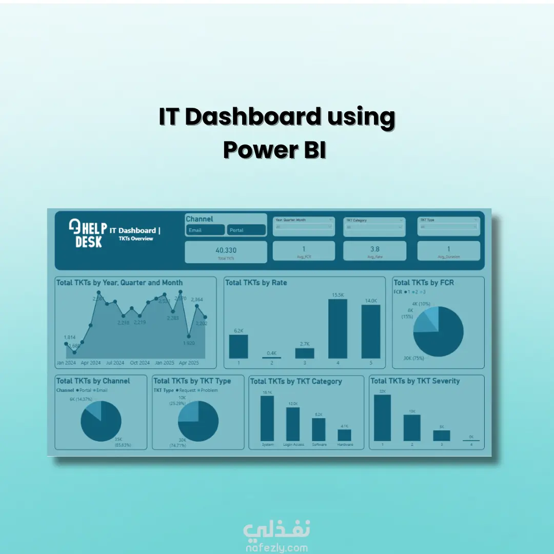 هذا المشروع عبارة عن لوحة تحكم تفاعلية (Dashboard) مصممة على Excel لعرض وتحليل بيانات تذاكر الدعم الفني (Help Desk Tickets). تم بناء الداشبورد بشكل احترافي يتيح تتبع أداء النظام وتحليل مؤشرات الأداء الرئيسية (KPIs) مثل: إجمالي عدد التذاكر (Total TKTs) معدل الحل من أول مرة (FCR) متوسط التقييم (Avg. Rate) متوسط مدة المعالجة (Avg. Duration) كما تم تقسيم البيانات بشكل بصري منظم من خلال رسوم بيانية متنوعة (Charts) تشمل: عدد التذاكر حسب الشهر، الربع، والسنة تصنيف التذاكر حسب القناة (Channel)، النوع (Type)، الفئة (Category)، ودرجة الخطورة (Severity) تحليل التذاكر حسب معدل التقييم (Rate) ونسبة الحل من أول مرة (FCR) تم تصميم الواجهة بأسلوب حديث واحترافي باستخدام الألوان التفاعلية، مع إضافة فلاتر (Slicers) تسهّل عرض وتحليل البيانات بطريقة مرنة وسريعة. النتيجة: داشبورد متكامل يمنح نظرة شاملة وواضحة عن أداء نظام الدعم الفني ويساعد على اتخاذ القرارات بناءً على بيانات دقيقة.