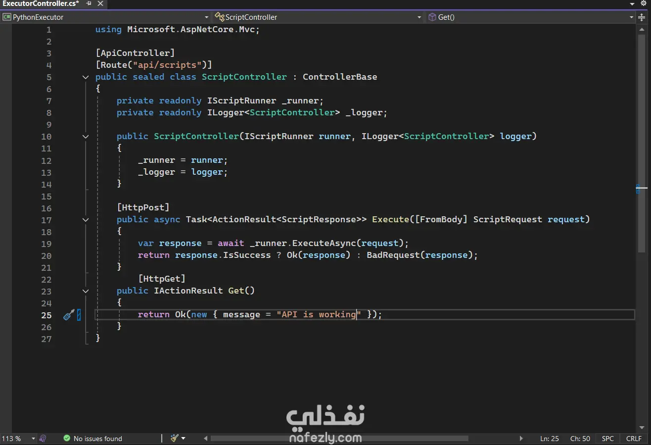 مشروع منفذ سكربتات بايثون هو تطبيق خلفي تم تطويره باستخدام ASP.NET Core Web API و Aspire، يهدف إلى تنفيذ سكربتات بايثون بشكل آمن من خلال واجهة برمجية (API). يمكن للمستخدم إرسال كود بايثون عبر طلب HTTP، ليتم تشغيله في بيئة محكومة، ثم يعاد الناتج أو الأخطاء على شكل استجابة JSON منظمة. يوضح هذا المشروع كيفية دمج لغات البرمجة المختلفة والتحكم في العمليات ومعالجة التنفيذ الآمن للأكواد.