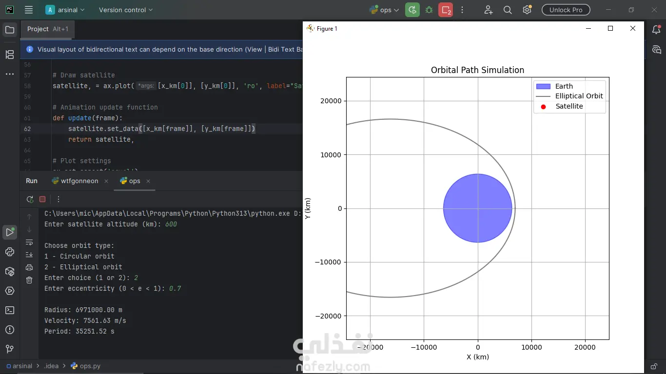 محاكاة المسار المداري محاكاة مبنية على بايثون، تُصوّر حركة الأقمار الصناعية حول الأرض باستخدام ميكانيكا مدارية حقيقية. يحسب المشروع السرعة المدارية، والفترة، والمسار باستخدام قانوني نيوتن وكبلر. يدعم البرنامج المدارات الدائرية والإهليلجية، مع إمكانية تخصيص الانحراف المركزي والارتفاع. تظهر الأرض في المركز، بينما يدور القمر الصناعي حولها ديناميكيًا في الوقت الفعلي. بُني البرنامج باستخدام Matplotlib وNumPy، مع حركة متحركة مدعومة بـ FuncAnimation. يوفر البرنامج نمذجة فيزيائية دقيقة، مع الحفاظ على تفاعلية بصرية وبساطة. يمكن توسيعه ليشمل زوايا الميل وتصورًا مداريًا ثلاثي الأبعاد. أداة رائعة لتعلم وعرض مفاهيم ديناميكيات الفضاء والديناميكا الفلكية الأساسية. أُنشئ كجزء من استكشافي الشخصي في تكنولوجيا الفضاء وميكانيكا المدارات.