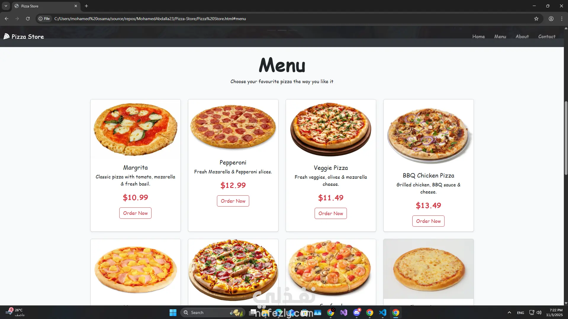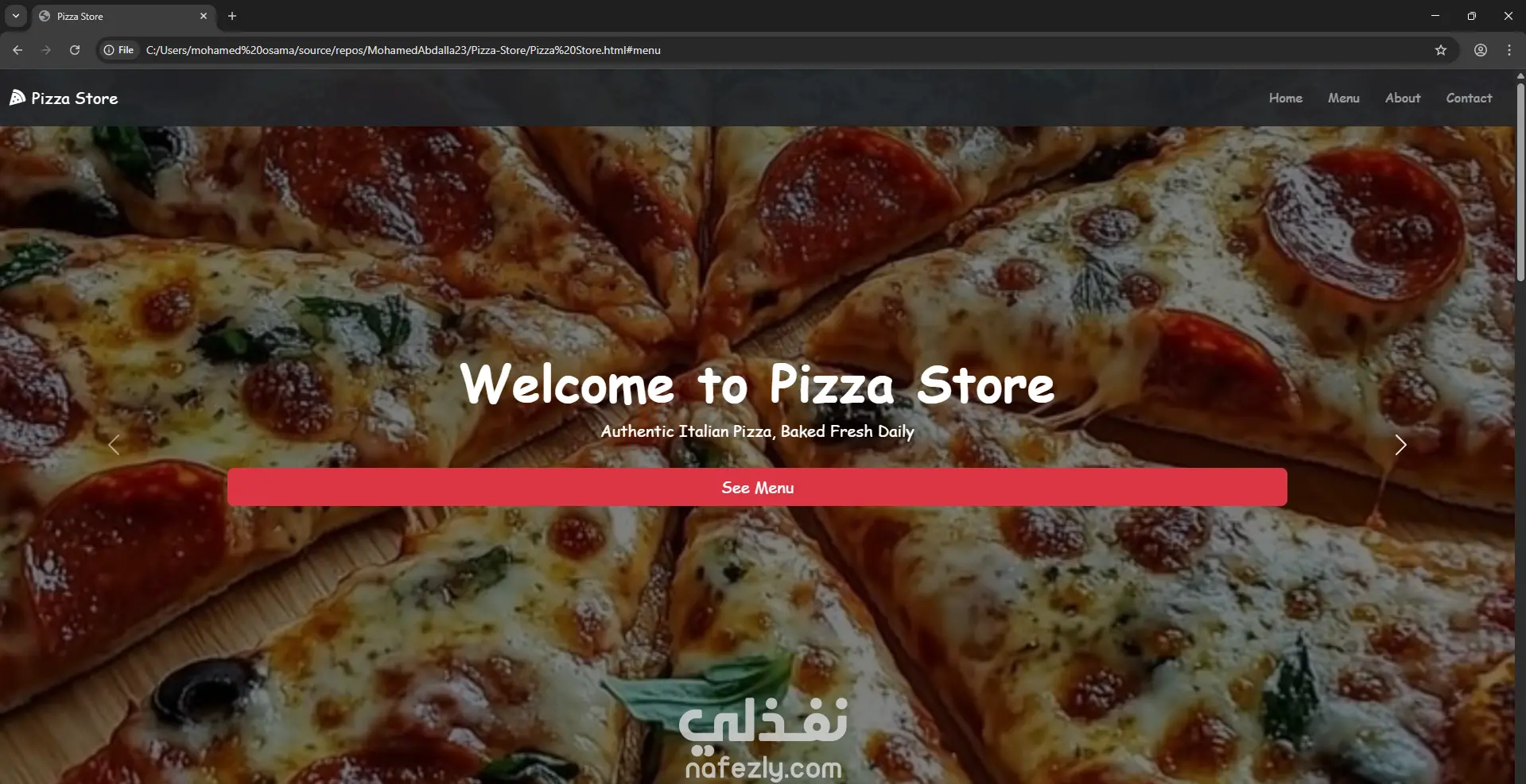 Pizza Store هو موقع ويب متكامل تم تصميمه باستخدام HTML وCSS وBootstrap لعرض متجر بيتزا تفاعلي يتميّز بتصميم عصري وواجهة مستخدم جذّابة وسهلة الاستخدام. يهدف المشروع إلى تقديم تجربة تصفّح سلسة للعميل، مع التركيز على عرض المنتجات (البيتزا) بطريقة مرتبة وواضحة، مع صور عالية الجودة وأسعار ومكونات كل نوع. يتضمن المشروع مجموعة من الصفحات والميزات الأساسية، مثل: الصفحة الرئيسية: تعرض أبرز أنواع البيتزا والعروض الخاصة بطريقة مميزة. صفحة القائمة (Menu): تحتوي على جميع المنتجات مع تقسيمها حسب الفئات (كلاسيك، سبايسي، فيجي...). نظام السلة (Cart) بشكل مبدئي لتجميع الطلبات قبل الشراء. صفحة التواصل (Contact Us) مع نموذج لإرسال الرسائل أو الاستفسارات. تصميم متجاوب (Responsive Design) بفضل استخدام Bootstrap، مما يجعل الموقع يعمل بشكل مثالي على جميع الأجهزة (حاسوب، تابلت، أو هاتف). تم التركيز على التوازن بين الجمال والوظيفة، باستخدام ألوان دافئة تتناسب مع هوية متجر البيتزا، وأزرار واضحة تشجع المستخدم على التفاعل والطلب بسهولة.