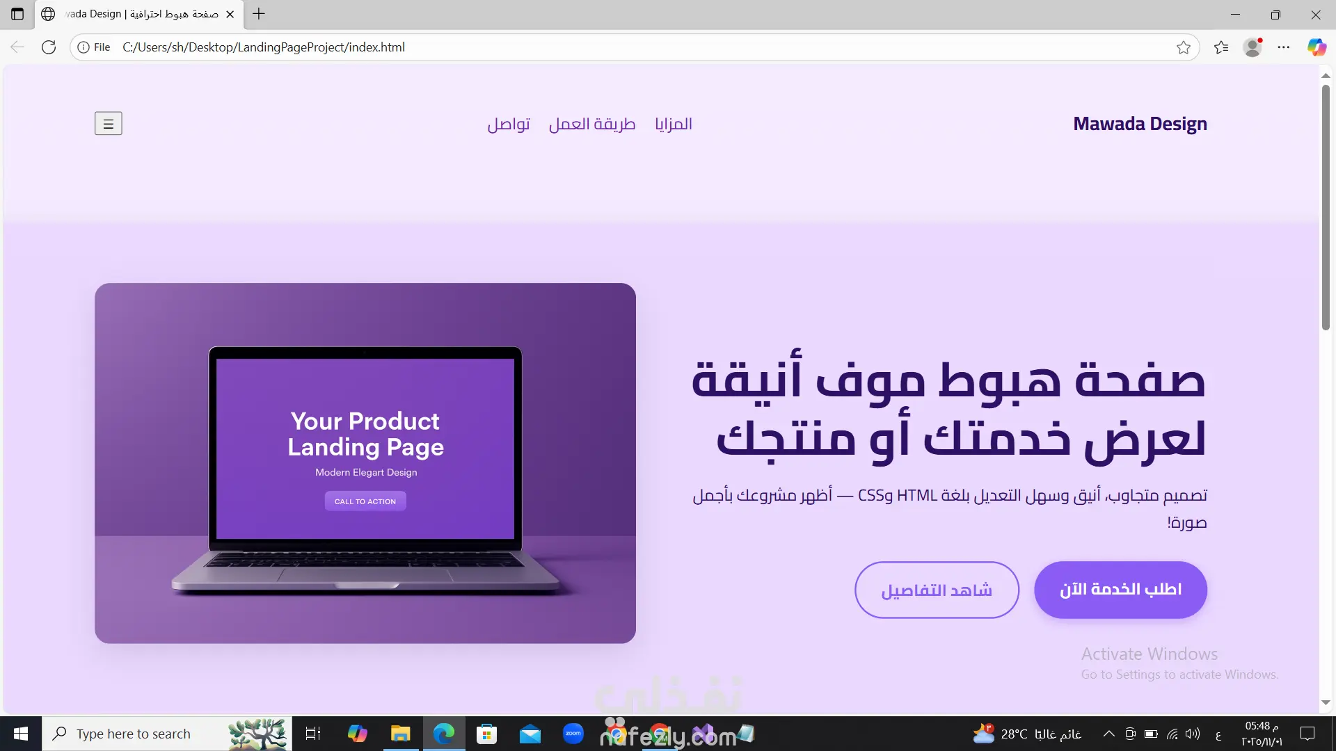 سأقوم بتصميم صفحة هبوط احترافية باستخدام HTML وCSS بشكل متجاوب مع جميع الأجهزة (موبايل – تابلت – كمبيوتر)، مع مراعاة تجربة المستخدم والتصميم العصري.