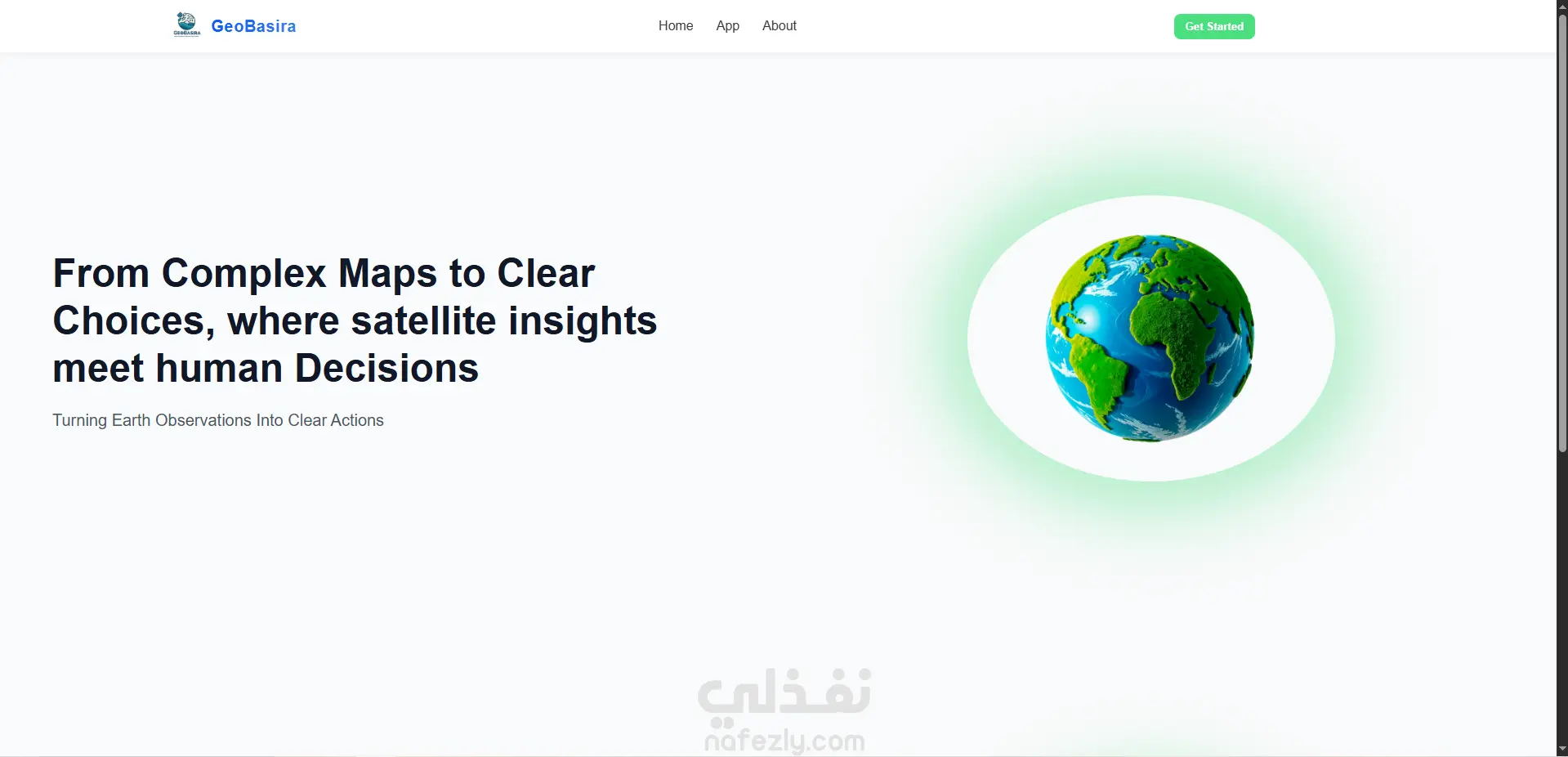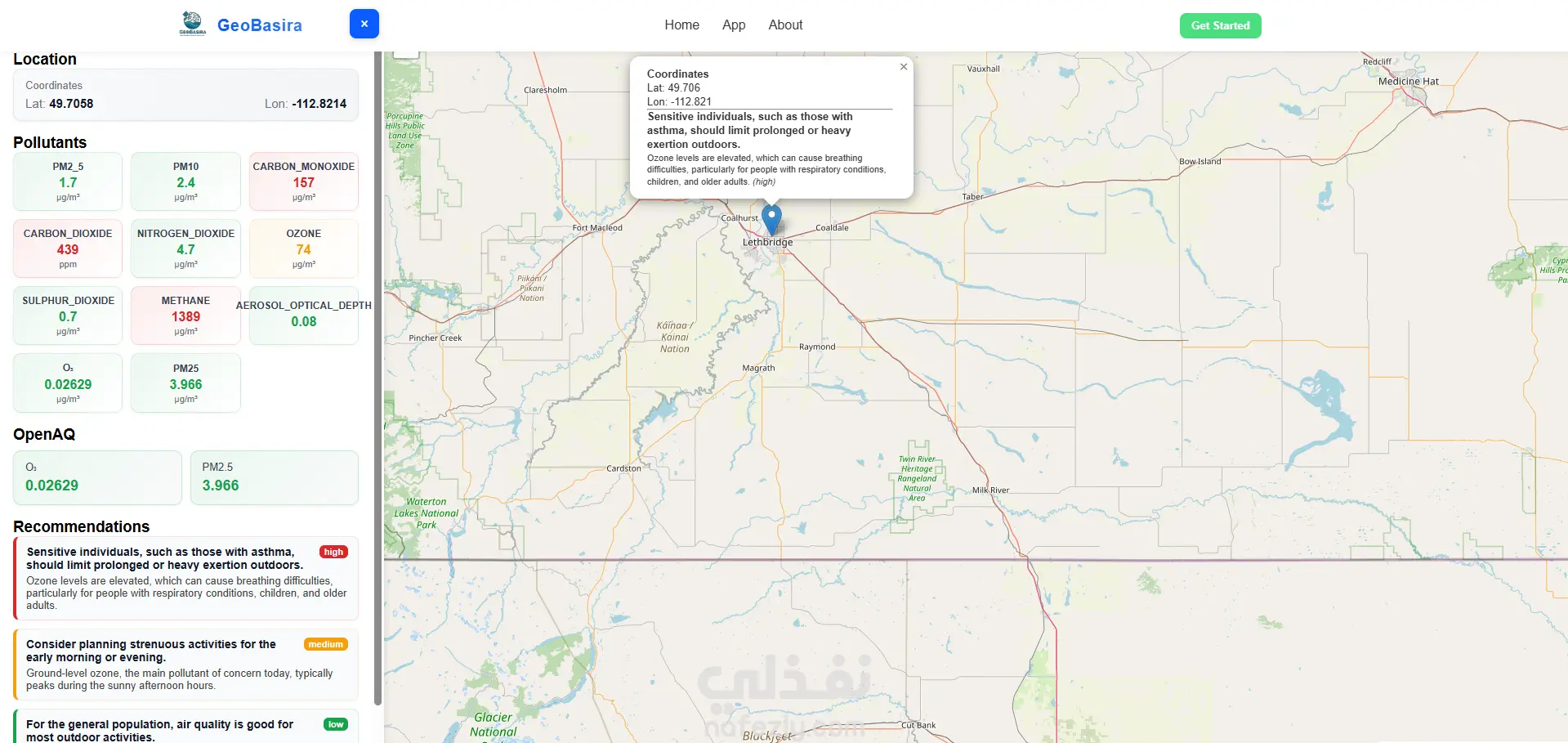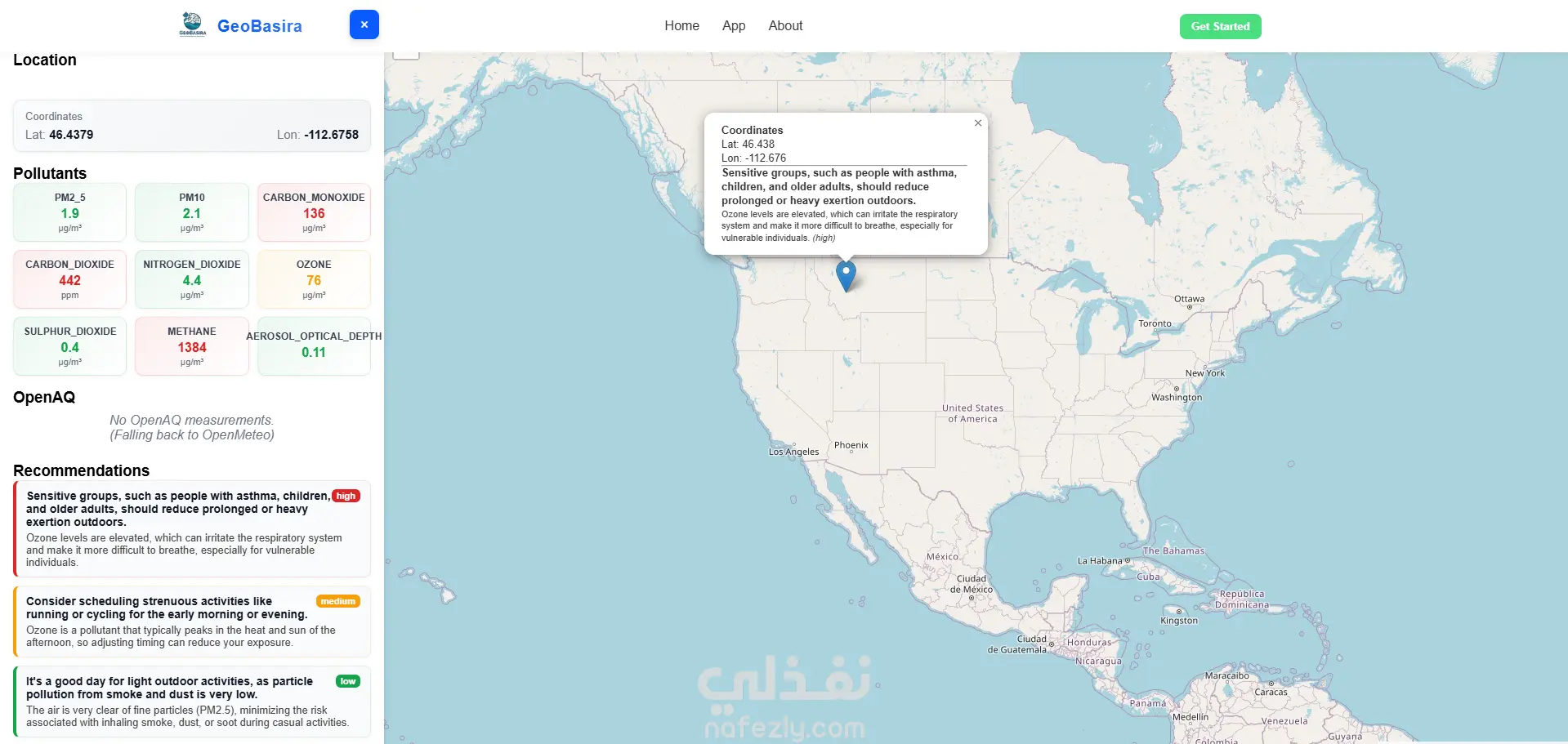 GeoBasira هو موقع ويب ذكي وتفاعلي تم تطويره باستخدام React.js في الواجهة الأمامية وFastAPI في الواجهة الخلفية، كجزء من مشاركتنا في تحدي NASA Space Apps Challenge. تقوم المنصة بجمع وتحليل بيانات الطقس وجودة الهواء من OpenAQ وOpen-Meteo، ثم تستخدم هذه البيانات لتقديم توصيات ذكية حول مدى أمان الخروج في موقع معيّن استنادًا إلى الظروف الجوية ونسب التلوث في المنطقة. يمكن للمستخدم اختيار أي موقع على الخريطة لتوليد تقرير بيئي مخصص، مع واجهة سهلة الاستخدام وتصميم سريع الاستجابة. يعمل النظام بشكل أكثر دقة في أمريكا الشمالية، مع توسّع تدريجي لدعم مناطق أخرى. يتم استضافة الموقع على نطاق خاص وفريد من نوعه .earth تأكيدًا على رؤيتنا لبناء حلول تقنية لخدمة كوكبنا.
