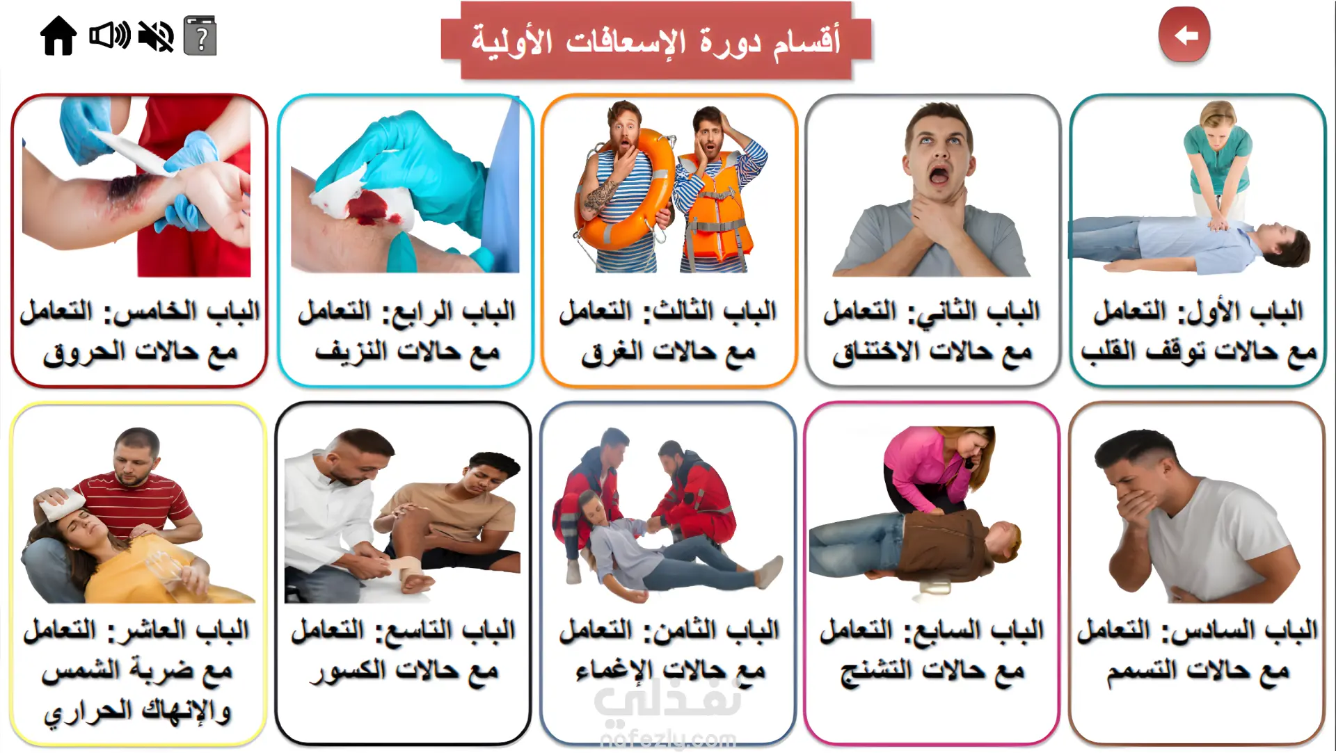 كورس الإسعافات الأولية هو برنامج تدريبي تفاعلي صُمّم بهدف تزويد المتدربين بالمعرفة والمهارات الأساسية للتعامل السليم مع الحالات الطارئة وإنقاذ الأرواح في الدقائق الأولى الحرجة قبل وصول المساعدة الطبية. تم إعداد هذا الكورس بأسلوب "تصميم تعليمي احترافي" يجمع بين المحتوى النظري المبسط، والأنشطة التفاعلية، والسيناريوهات الواقعية التي تحاكي مواقف حقيقية قد يتعرض لها أي شخص في حياته اليومية أو بيئة العمل. 🎯 أهداف الكورس: _تمكين المتدرب من التعرف على الحالات الطارئة الشائعة. _إكساب مهارات الإسعاف الأولي الأساسية بطريقة عملية وسهلة التطبيق. _تعزيز القدرة على اتخاذ القرار السريع والصحيح في المواقف الحرجة. _نشر ثقافة السلامة والوقاية داخل المجتمع وبيئات العمل. 📚 محتوى الكورس يشمل: _ الإنعاش القلبي الرئوي (CPR) وتوقف القلب. _ الغرق والتعامل مع المصاب. _ النزيف بأنواعه والإسعافات المناسبة. _ الحروق ودرجاتها وطرق الإسعاف. _ التسمم بأنواعه (غذائي – دوائي – كيميائي – غازات). _ ضربة الشمس والإنهاك الحراري. _ التشنجات والإغماء. _ الكسور والإصابات العضلية. _ الوقاية من المخاطر والأخطاء الشائعة في الإسعاف الأولي. 🎮 أسلوب التقديم: - أنشطة تفاعلية (سحب وإفلات – ترتيب خطوات – اختيار من متعدد). - سيناريوهات تعليمية تحاكي الواقع. - أسئلة تقييمية (صح وخطأ – اختيارات متعددة). - تغذية راجعة فورية لتعزيز التعلم. - مناسب للتنفيذ عبر Articulate Storyline / PowerPoint التفاعلي. 👥 الفئة المستهدفة: - غير المتخصصين في المجال الطبي. -الموظفون في الشركات والمؤسسات. -المعلمون والطلاب. - أولياء الأمور ومقدمو الرعاية. - أي شخص مهتم بتعلم الإسعافات الأولية وإنقاذ الأرواح. 🏅مخرجات التعلم: بنهاية الكورس يصبح المتدرب قادرًا على: - التعامل بثقة مع الحالات الطارئة الشائعة. - تطبيق خطوات الإسعاف الأولي بشكل صحيح وآمن. - تجنب الأخطاء الشائعة التي قد تعرض المصاب للخطر. 📜 يُمنح المتدرب شهادة إتمام معتمدة من جهة التدريب.