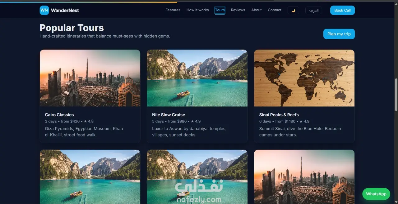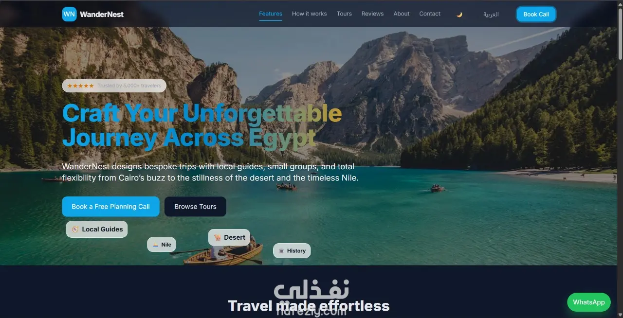 تم تصميم وتطوير موقع احترافي لشركة الرحلات WanderNest يقدّم تجربة مستخدم سلسة لاستكشاف الجولات السياحية في مصر. يتضمن الموقع عرض عروض السفر، المميزات، آلية العمل، آراء العملاء، ونموذج حجز مكالمة مجانية. تم التركيز على بصريّات جذابة، محتوى عربي وانجليزي متوافق مع الهوية، وسهولة التصفح عبر مختلف الأجهزة، بهدف تحسين تجربة المسافر وزيادة التحويلات والحجوزات.