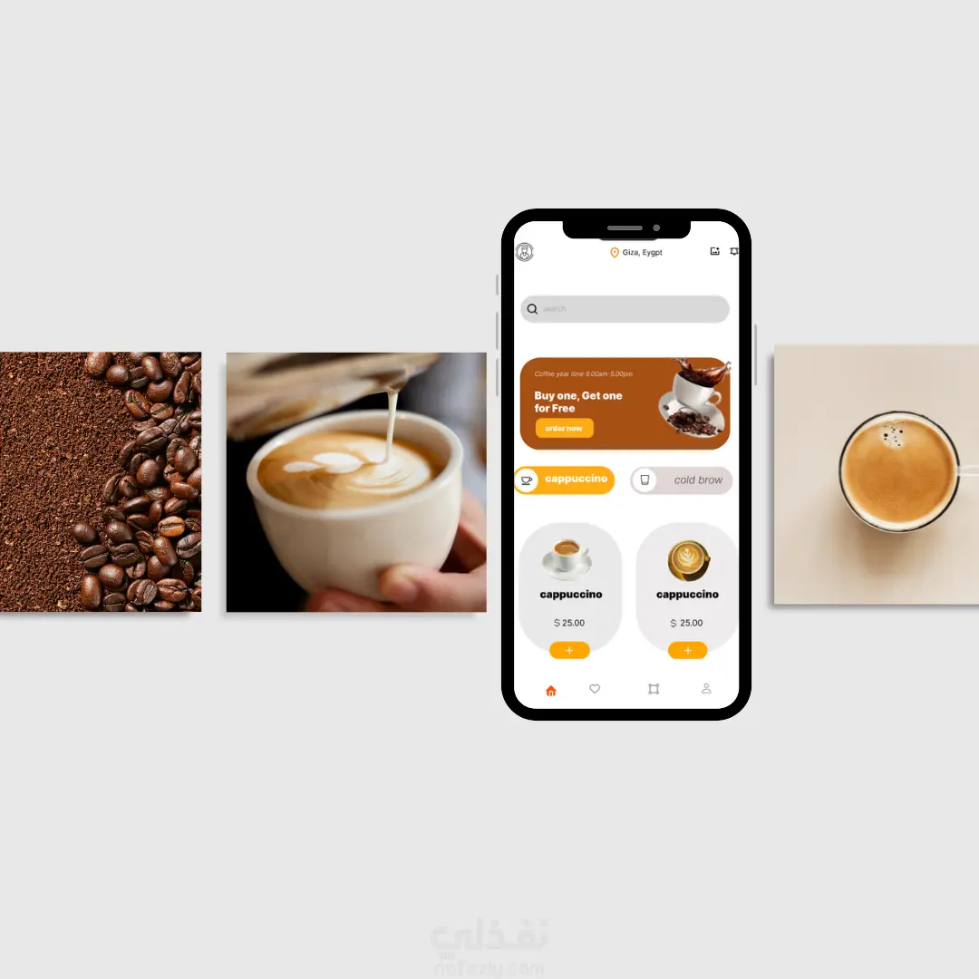 تصميم واجهة مستخدم لتطبيق مخصص لطلب القهوة بطريقة سهلة وسريعة.