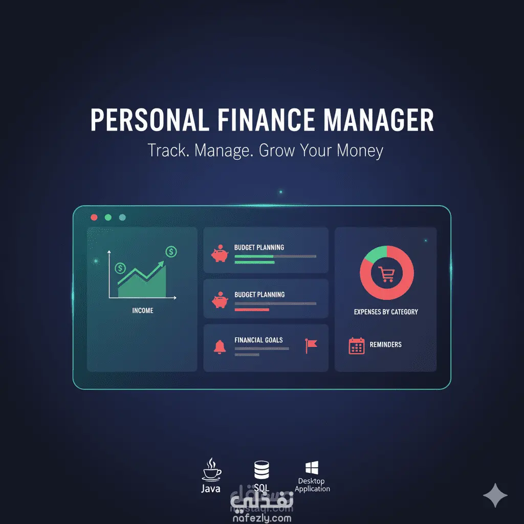 برنامج إدارة المصاريف الشخصية (Personal Finance Manager) ده تطبيق معمول بلغة Java عشان يساعد المستخدمين يتابعوا ويديروا كل أنشطتهم المالية في مكان واحد. المميزات (Features) النظام بيسمح للمستخدم بإدارة كل جوانب تمويله الشخصي عن طريق الصفحات دي: صفحة الدخل (Income Page): تقدر تضيف وتشوف مصادر دخلك المختلفة. صفحة المصاريف (Expenses Page): تقدر تتابع مصاريفك متقسمة حسب الفئة (category) والتاريخ. صفحة الميزانية (Budget Page): تقدر تحط خطط ميزانية وتعدّلها. صفحة التذكيرات (Reminder Page): تقدر تعمل تذكيرات بمواعيد الدفع والمهام المالية. صفحة الأهداف المالية (Financial Goals Page): تقدر تحدد وتتابع أهدافك المالية طويلة المدى. صفحة التبرعات (Donations Page): تقدر تتابع تبرعاتك وسجل العطاء بتاعك.