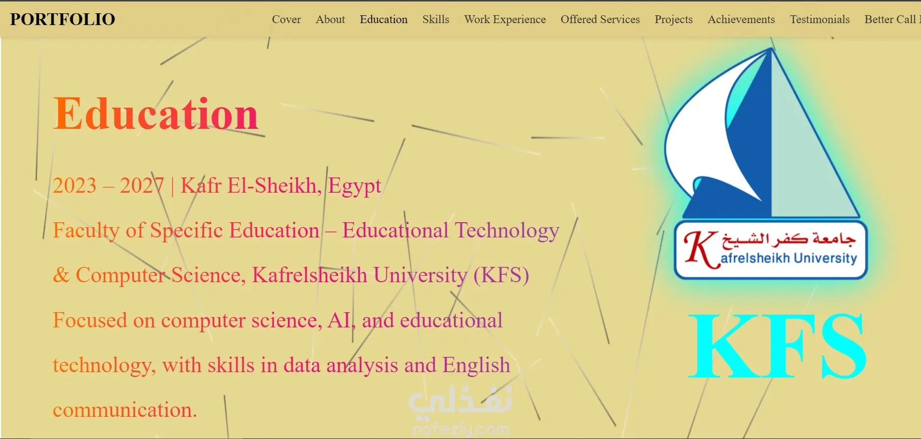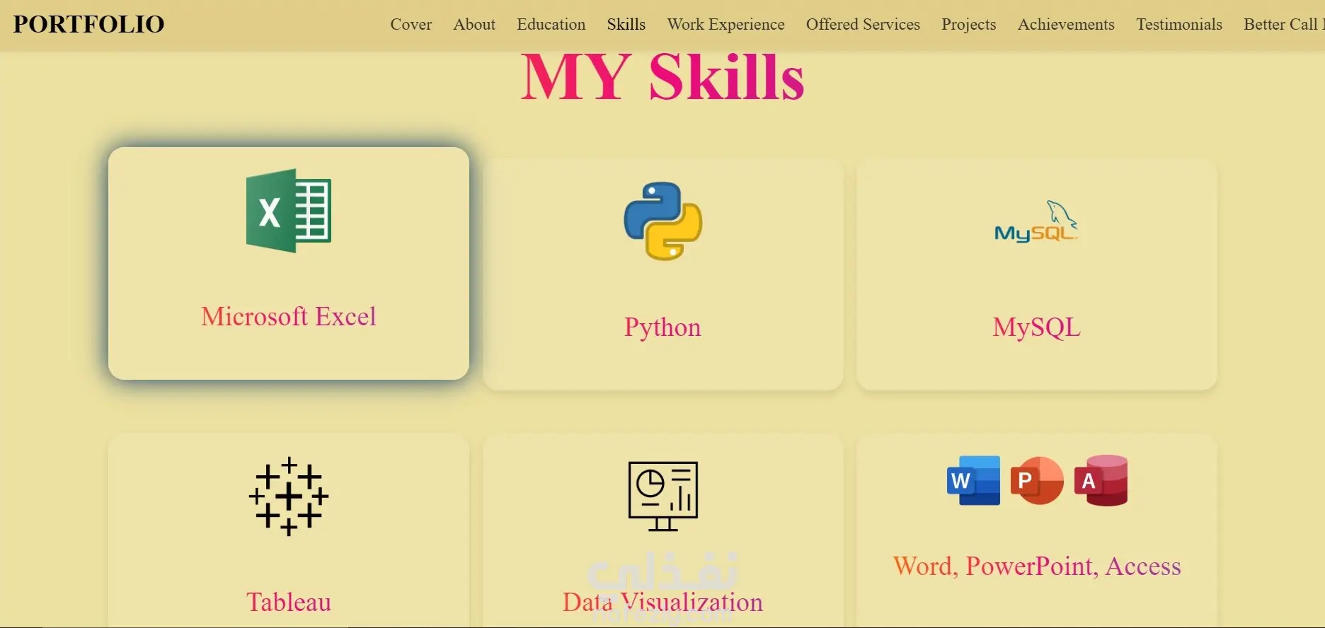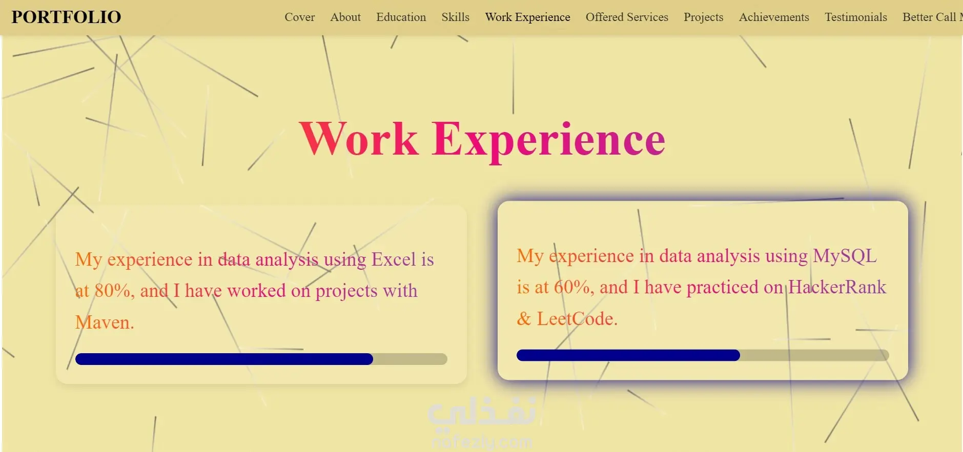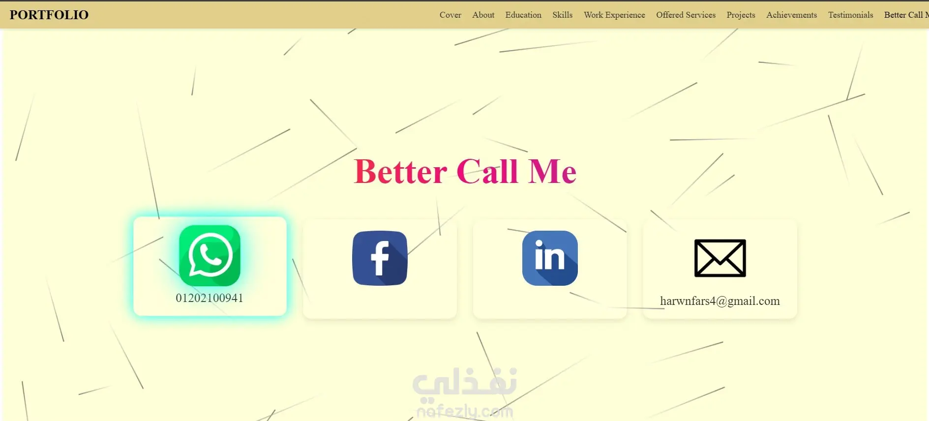 عمل PORTFOLIO احترافى مكون من 10 سكاشن وهى : Cover About Me MY Skills Work Experience Offered Services Projects Achievements Testimonials EducationBetter Call Me