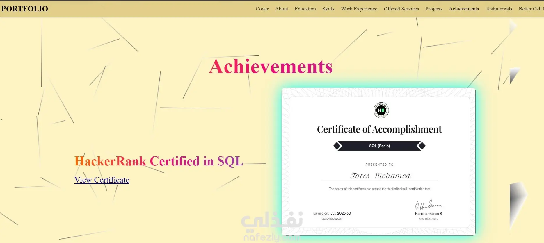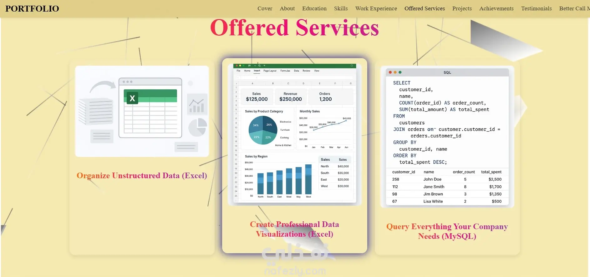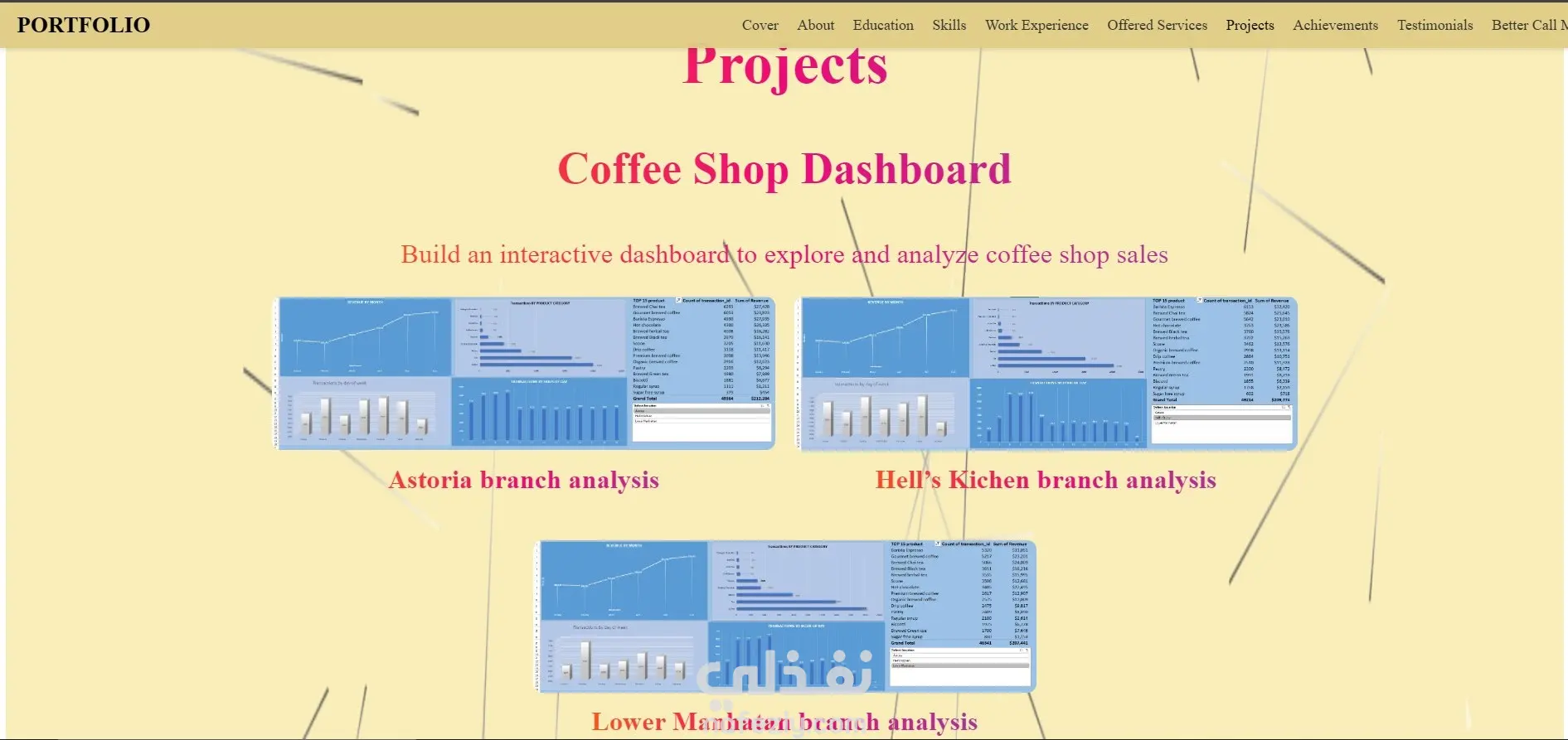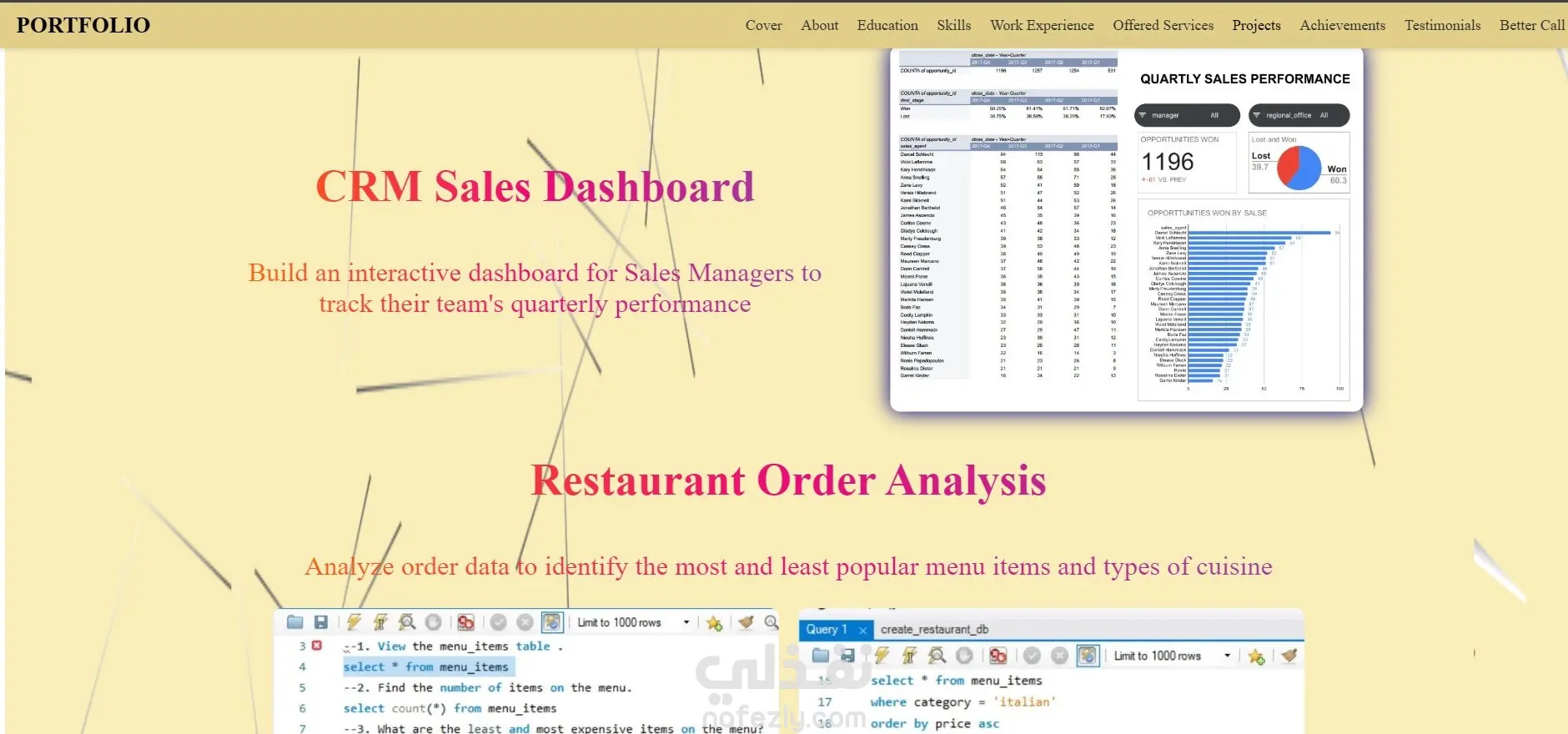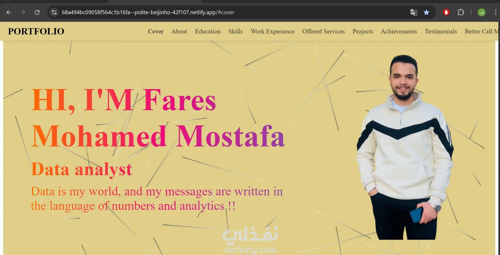 عمل PORTFOLIO احترافى مكون من 10 سكاشن وهى : Cover About Me MY Skills Work Experience Offered Services Projects Achievements Testimonials EducationBetter Call Me