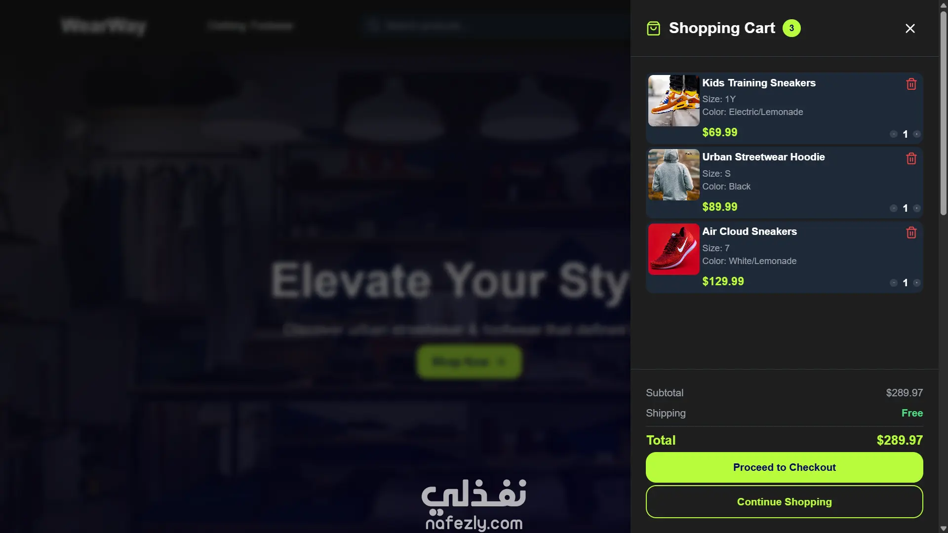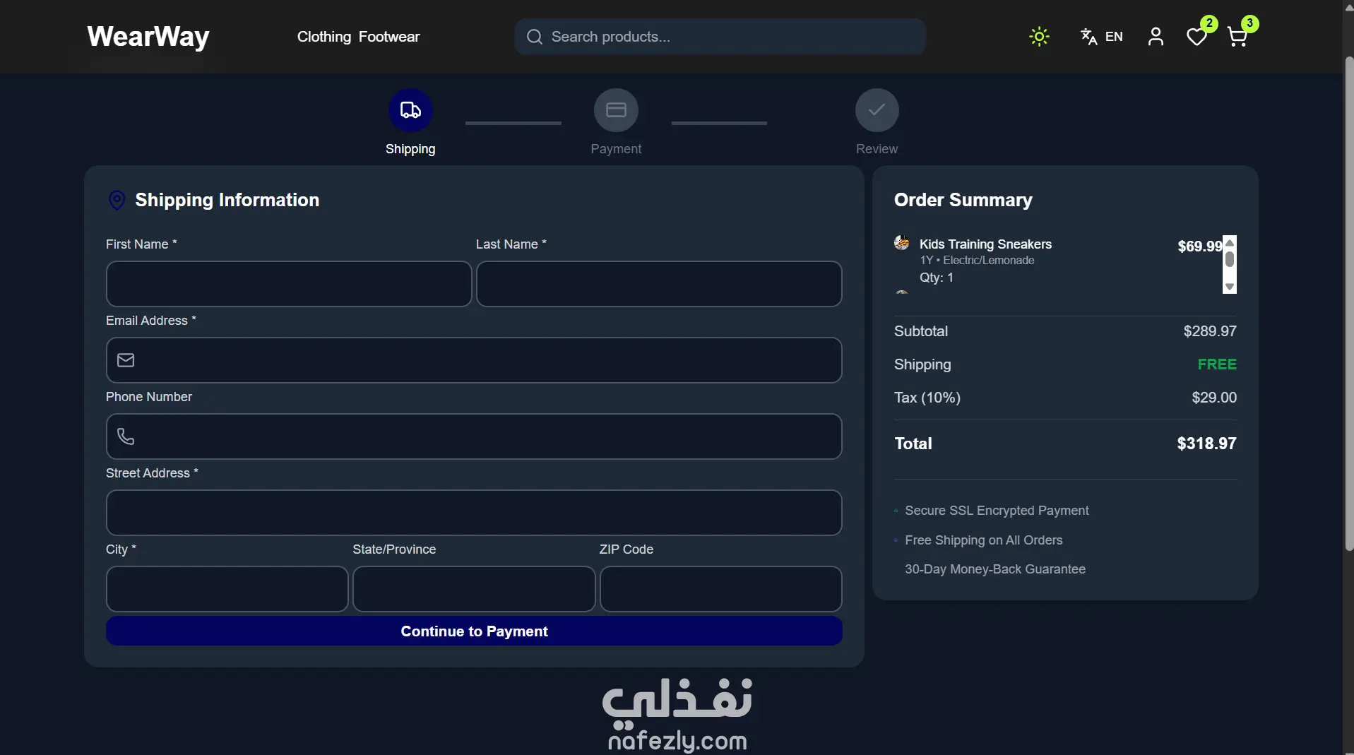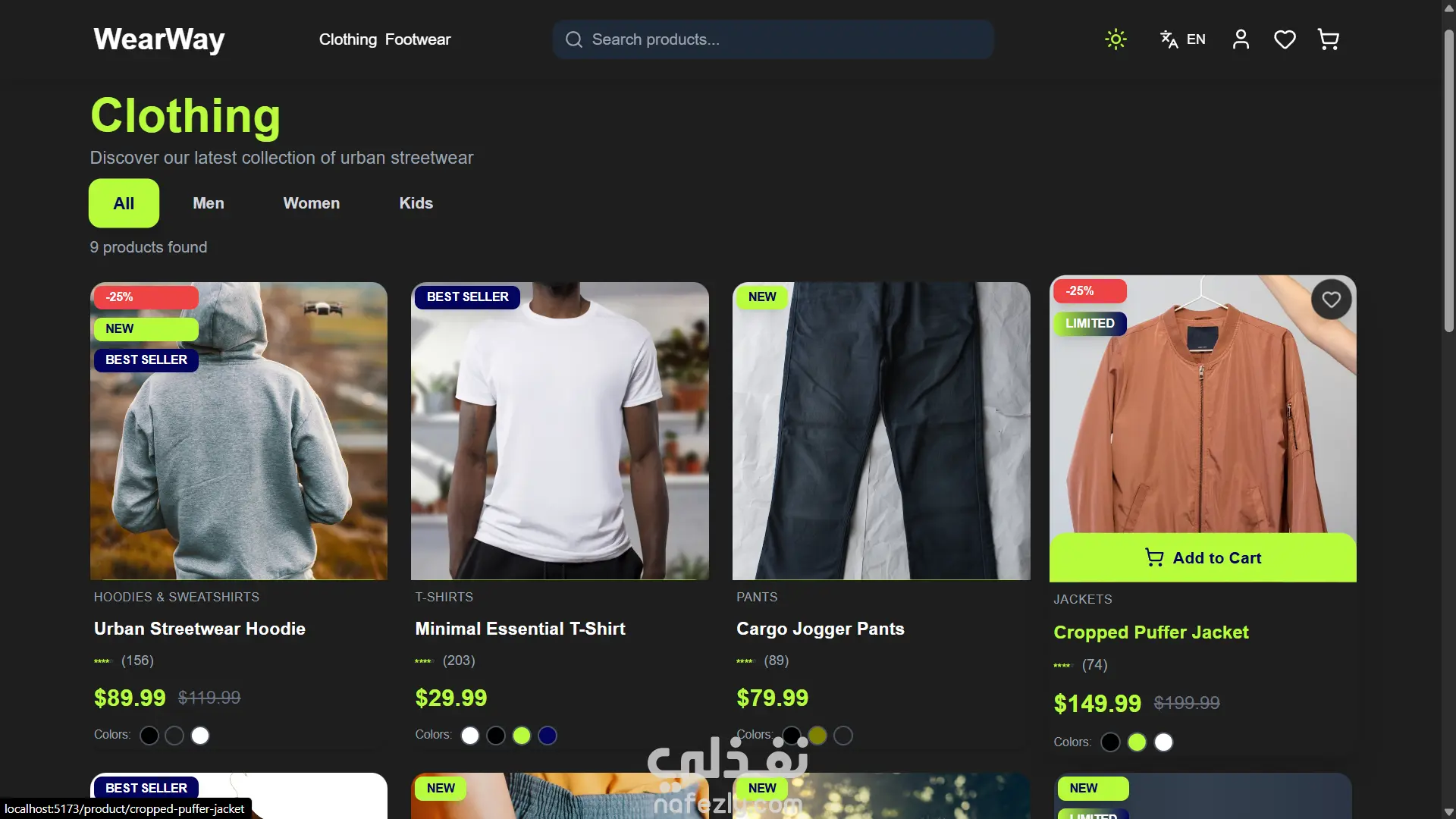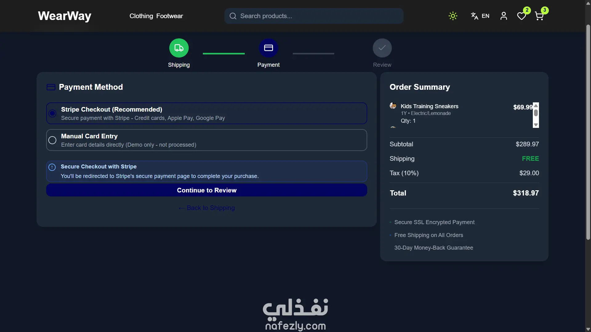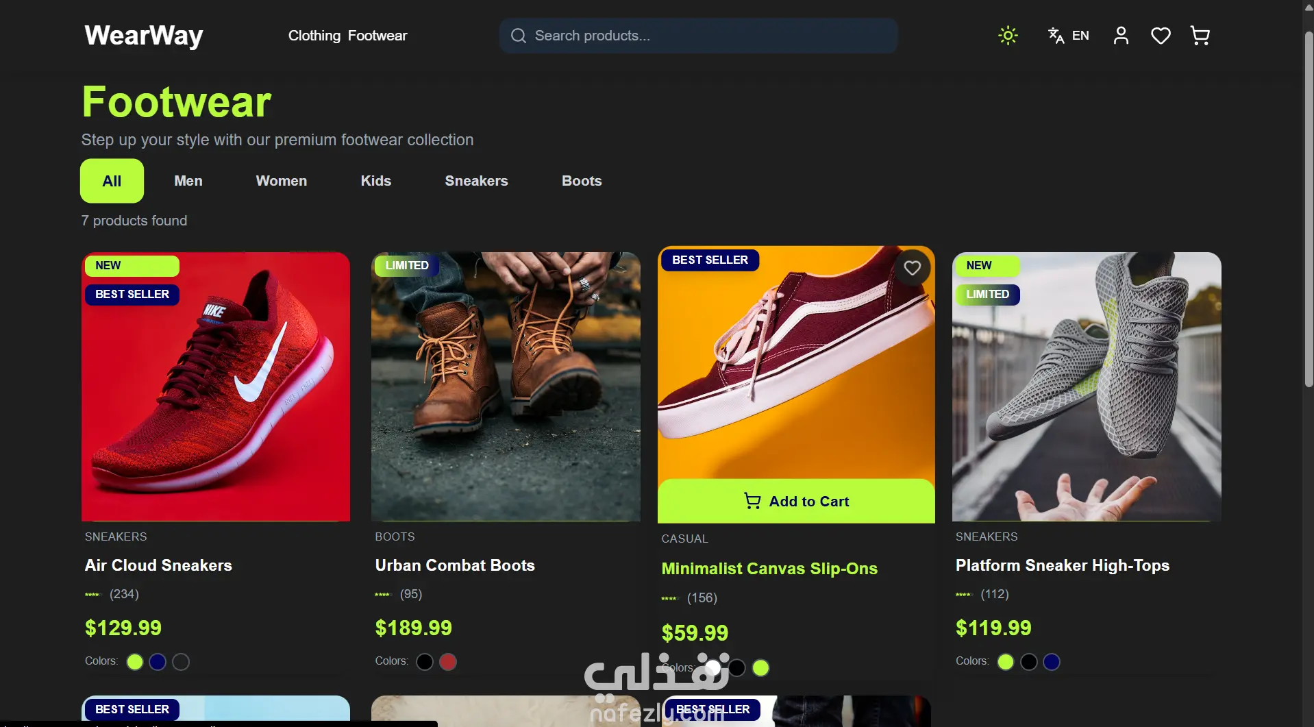 **مشروع WearWay – منصة تجارة إلكترونية عصرية للملابس والأحذية** مشروع **WearWay** هو موقع تجارة إلكترونية كامل ومتكامل تم تطويره باستخدام **React + TypeScript + Tailwind CSS**، بيقدّم تجربة تسوق أنيقة وسلسة مستوحاة من أجواء **الـStreetwear الحديثة**. الموقع سريع، متجاوب مع كل الأجهزة، وبيوفر واجهة استخدام عصرية وتجربة مستخدم مريحة. **المميزات:** * ️ كتالوج منتجات للملابس والأحذية مع تصفية وفرز متقدم * سلة مشتريات وقائمة رغبات مع دعم المقاسات والألوان * دمج دفع آمن عبر **Stripe Payment Links** * وضع داكن وفاتح مع حفظ التفضيلات * دعم لغتين (إنجليزي وعربي) مع **RTL** * تصميم متجاوب بالكامل وتجربة مثالية على الموبايل * بحث لحظي بالمنتجات * أداء عالي بفضل **Lazy Loading** و**Code Splitting** * أنيميشن سلس باستخدام **Framer Motion** * إدارة حالة خفيفة وسريعة بـ **Zustand**