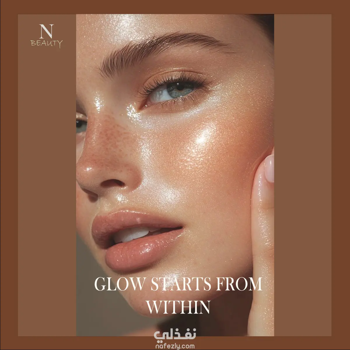 A modern and elegant social media post created for a skincare and makeup brand. The design focuses on natural beauty, soft tones, and a clean aesthetic that highlights the model’s confidence and glow.