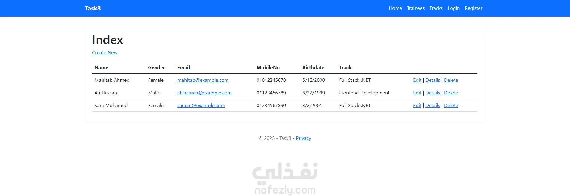 تمّ تطوير تطبيق ويب احترافي لإدارة المتدربين (Trainees) والمسارات (Tracks) والدورات (Courses) باستخدام ASP.NET Core MVC وEntity Framework Core (Code First)، مع تطبيق مبدأ الـRepository Pattern وخدمة Dependency Injection لهيكل برمجي نظيف وقابل للتوسّع. يشمل النظام جميع عمليات CRUD (إضافة، تعديل، حذف، عرض) للبيانات، مع تطبيق العلاقات بين الجداول: علاقة واحد لمتعدد (1:M) بين المسارات والمتدربين. علاقة متعدد لمتعدد (M:M) بين المتدربين والدورات عبر جدول وسيط (TraineeCourse). تم تعزيز واجهة المستخدم بتصميم أنيق باستخدام Bootstrap وتقنيات Styling & Bundling لتحسين الأداء والمظهر العام، مع الاستفادة من TagHelpers مثل <environment> و<partial> لتنظيم العرض. تم دمج نظام Identity لإدارة تسجيل المستخدمين وتسجيل الدخول والخروج، مع توسيع فئة المستخدم (IdentityUser) بفئة جديدة Client تحتوي على معلومات إضافية (الاسم، الجنسية، المستوى التعليمي). كما تم تطبيق Attribute Routing وRoute Prefix على وحدات التحكم (Controllers) الخاصة بالمسارات، مع استخدام Route Constraints لضمان دقة التوجيه. بالإضافة إلى ذلك، تمت إضافة التحقق من صحة البيانات (Validation) من جهة العميل باستخدام مكتبات client-side packages لضمان تجربة استخدام سلسة واحترافية.