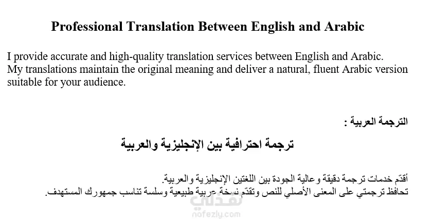أحرص دائمًا على أن تكون الترجمة خالية من الأخطاء الإملائية والنحوية، ومناسبة للسياق سواء كان تسويقي، تقني، أو أكاديمي.