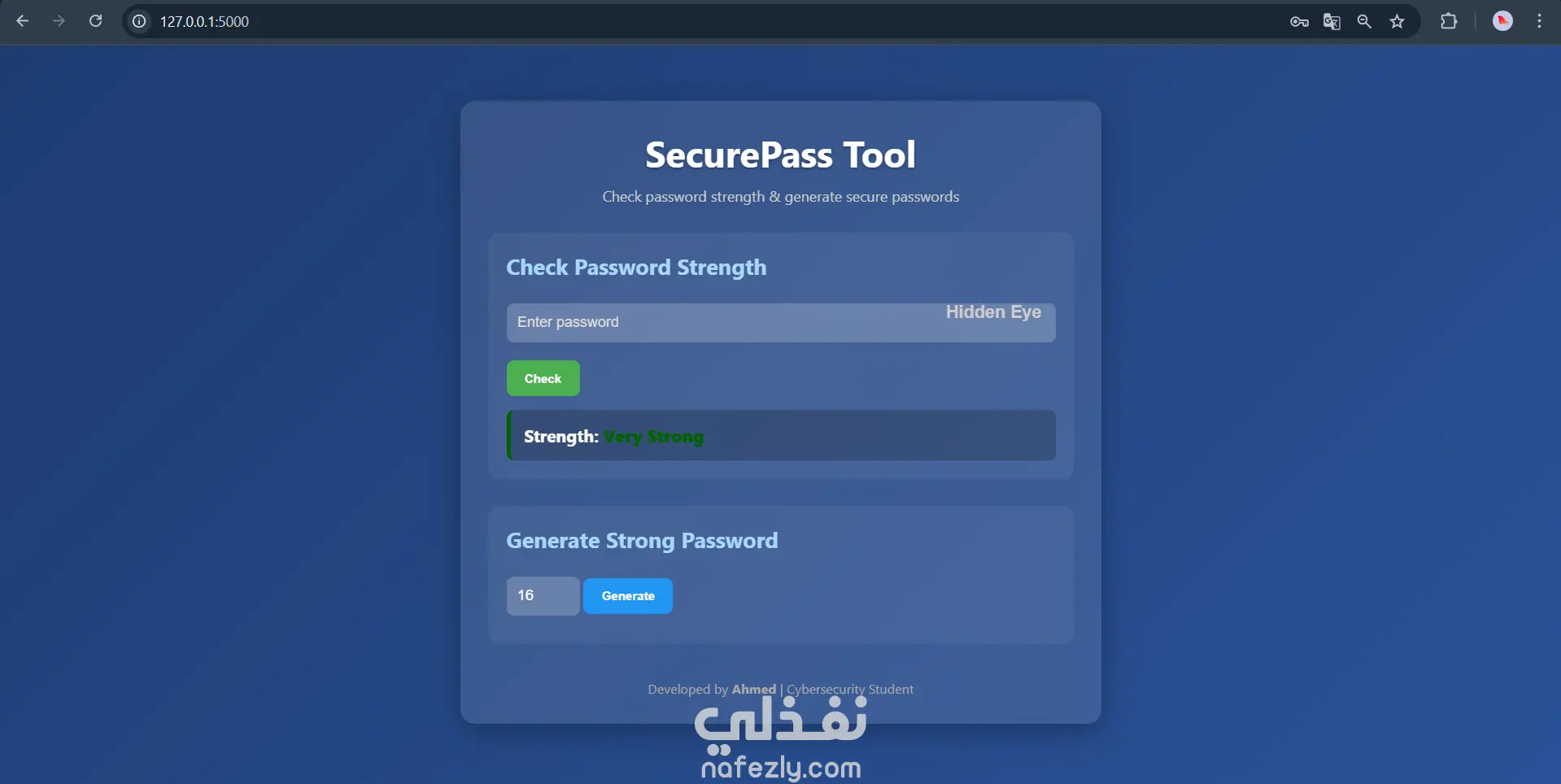 A modern web-based password strength checker and generator built with Flask. With : Real-time password strength analysis - Secure password generation (8-50 characters) - Copy to clipboard - Responsive & beautiful UI