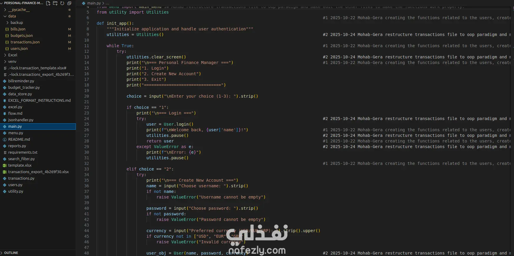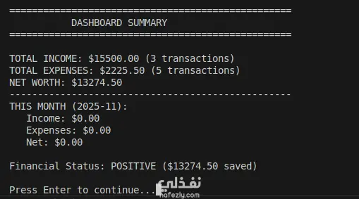 ملخص مشروع: نظام إدارة المالية الشخصية (Personal Finance Manager) قمت بتطوير تطبيق متكامل لإدارة الشؤون المالية الشخصية باستخدام لغة Python، وهو تطبيق يعتمد على الواجهة النصية (Console-based Application). يهدف المشروع إلى مساعدة المستخدمين على تتبّع الدخل والمصروفات والأهداف الادخارية، مع إمكانية تحليل الأداء المالي من خلال تقارير ولوحات معلومات تفاعلية. المميزات الأساسية: إدارة المستخدمين: دعم تعدد المستخدمين مع تسجيل الدخول باستخدام كلمة مرور مشفّرة (PIN/Password)، وإمكانية إنشاء ملفات تعريف (Profiles) وتبديلها بسهولة. إدارة المعاملات المالية: إضافة وتعديل وحذف المعاملات (دخل/مصروف) مع تأكيد الحذف، وتخزين معلومات مفصلة تشمل الفئة، التاريخ، طريقة الدفع، والوصف. نظام التقارير: إنشاء لوحات تحكم تلخّص الوضع المالي، مع تقارير شهرية وتحليل حسب الفئات، بالإضافة إلى عرض الاتجاهات في الإنفاق والدخل. البحث والتصفية: البحث حسب التاريخ أو الفئة أو النطاق المالي، مع إمكانية فرز النتائج لسهولة المراجعة. حفظ البيانات واستعادتها: تخزين البيانات في ملفات JSON وCSV مع خاصية الحفظ التلقائي (Auto-save)، ونظام نسخ احتياطي لتجنب فقدان البيانات. الجوانب التقنية: استخدمت مكتبات Python القياسية: datetime, csv, json, os, لضمان دقة العمليات المالية. تم اعتماد بنية بيانات واضحة باستخدام القواميس (Dictionaries) والقوائم (Lists) لإدارة المستخدمين والمعاملات. تم تطبيق التحقق من صحة المدخلات (Input Validation) ومعالجة الأخطاء (Error Handling) لضمان استقرار البرنامج. يتكوّن المشروع من ملف رئيسي main.py وأكثر من 10 دوال منظمة ذات توثيق (Docstrings) يشرح وظيفة كل منها.