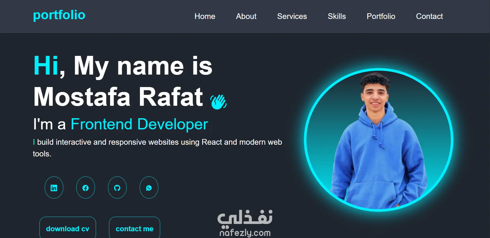 هذا مشروع موقع بورتفوليو شخصي قمت بتصميمه وتطويره باستخدام React.js وTailwind CSS.