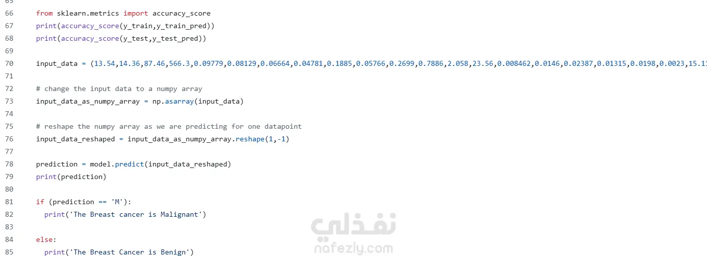 تمكنت من بناء موديل صغير باستخدام خوارزميات التعلم الألي الكلاسيكيه و باستخدام بيانات رقميه عن الثدي المصاب بالسرطان مثل حجم الخلايا السرطانيه و مدي تطابق حوافها و نصف قطر الخلايا السرطانيه و ذلك باسستخدام مكتبات مثل pandas و numpy و scikit learn