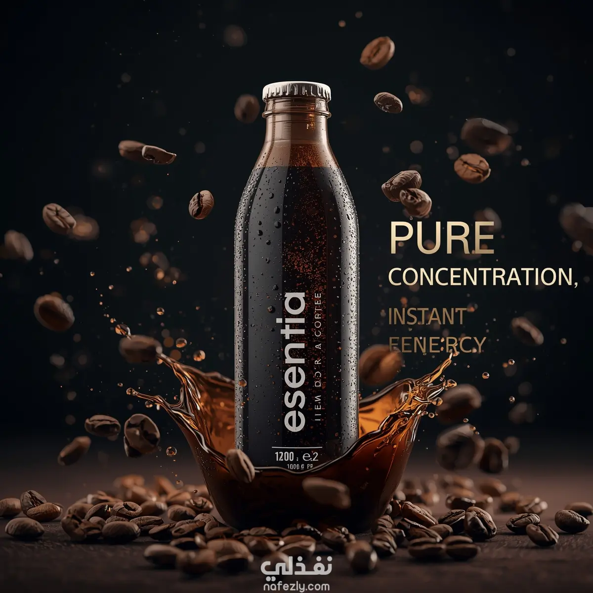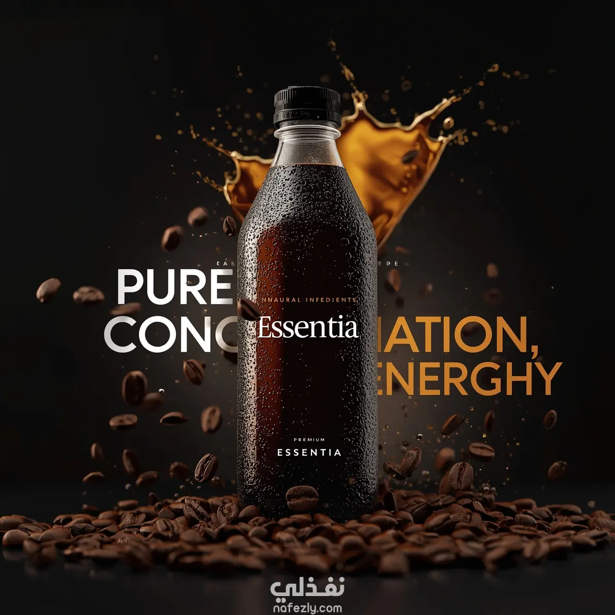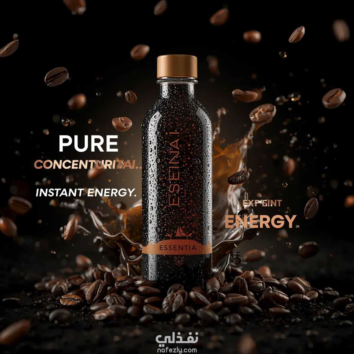 تصميم إعلاني واقعي لمشروب قهوة مركز (Essentia - Instant Energy)