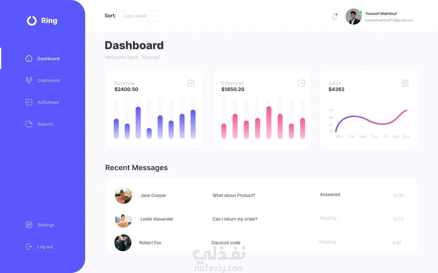 تصميم واجهة لوحة تحكم نظيفة وعصرية تم تصميمها لتوفير تجربة استخدام سلسة. يتضمن التخطيط التحليلات الرئيسية مثل الإيرادات والمصروفات والمبيعات، بالإضافة إلى رسائل العملاء الأخيرة لسهولة المتابعة. يركز التصميم على الوضوح والبساطة وسهولة التنقل، مع الاعتماد على نظام ألوان متناسق وعناصر استجابة مرنة. الأدوات: Figma