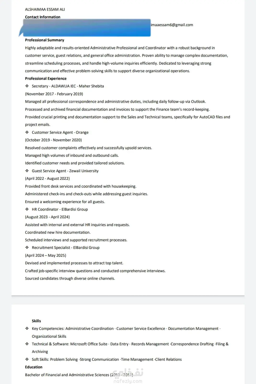 انشاء سير ذاتية نموذج من سيرتي الذاتية اللي بتوضح خبراتي ومهاراتي في مجالات الإدارة، خدمة العملاء، ومجال الموارد البشرية. بحب دايمًا أقدّم سيرتي الذاتية بشكل منظم وواضح يعكس مهاراتي في التواصل، والتنظيم، والاهتمام بالتفاصيل وكذلك السير الذاتية الاخري.