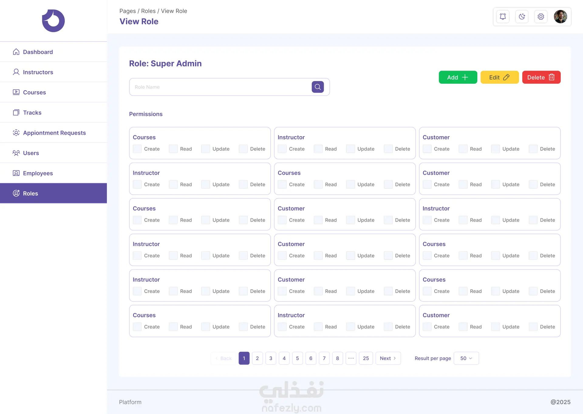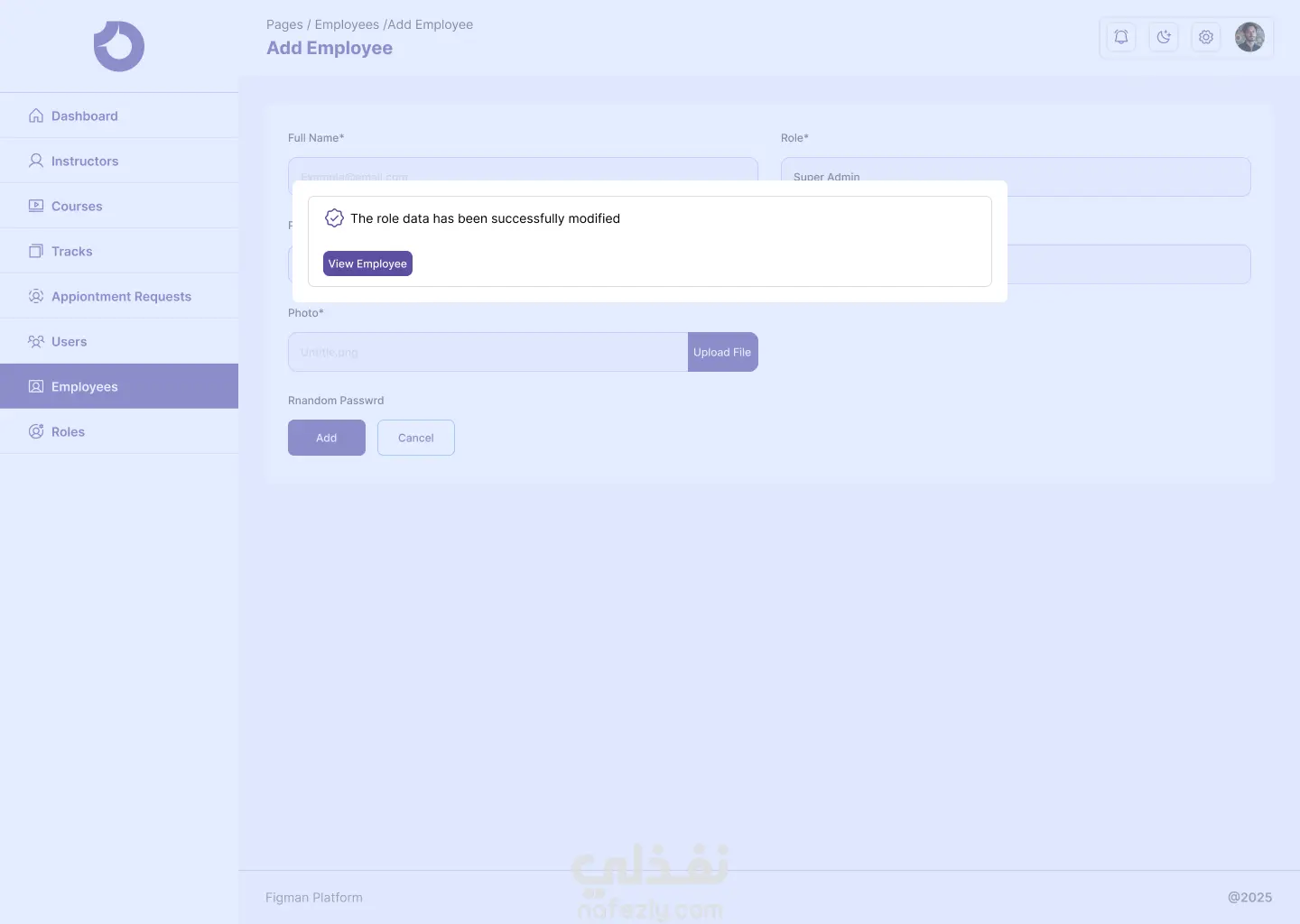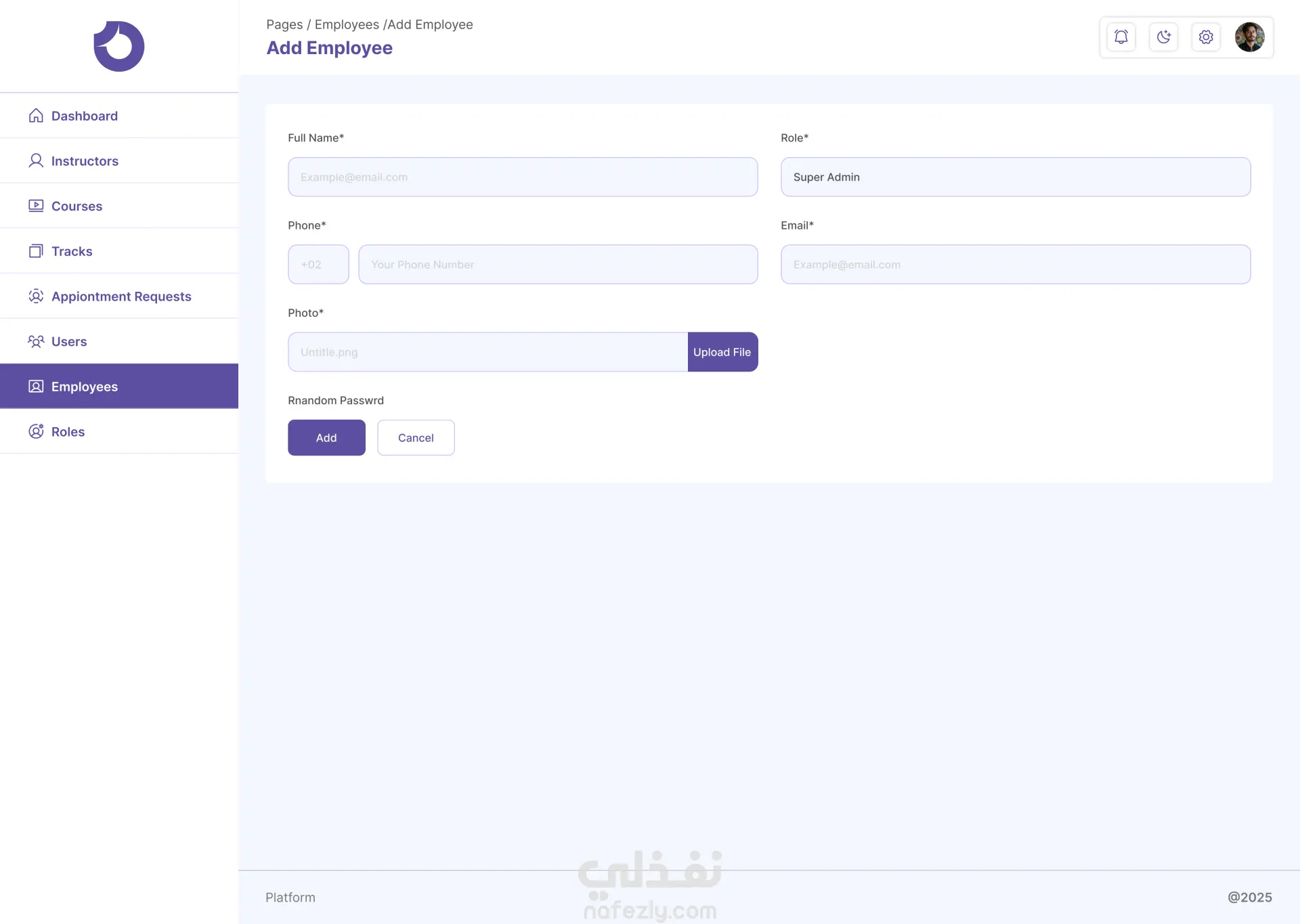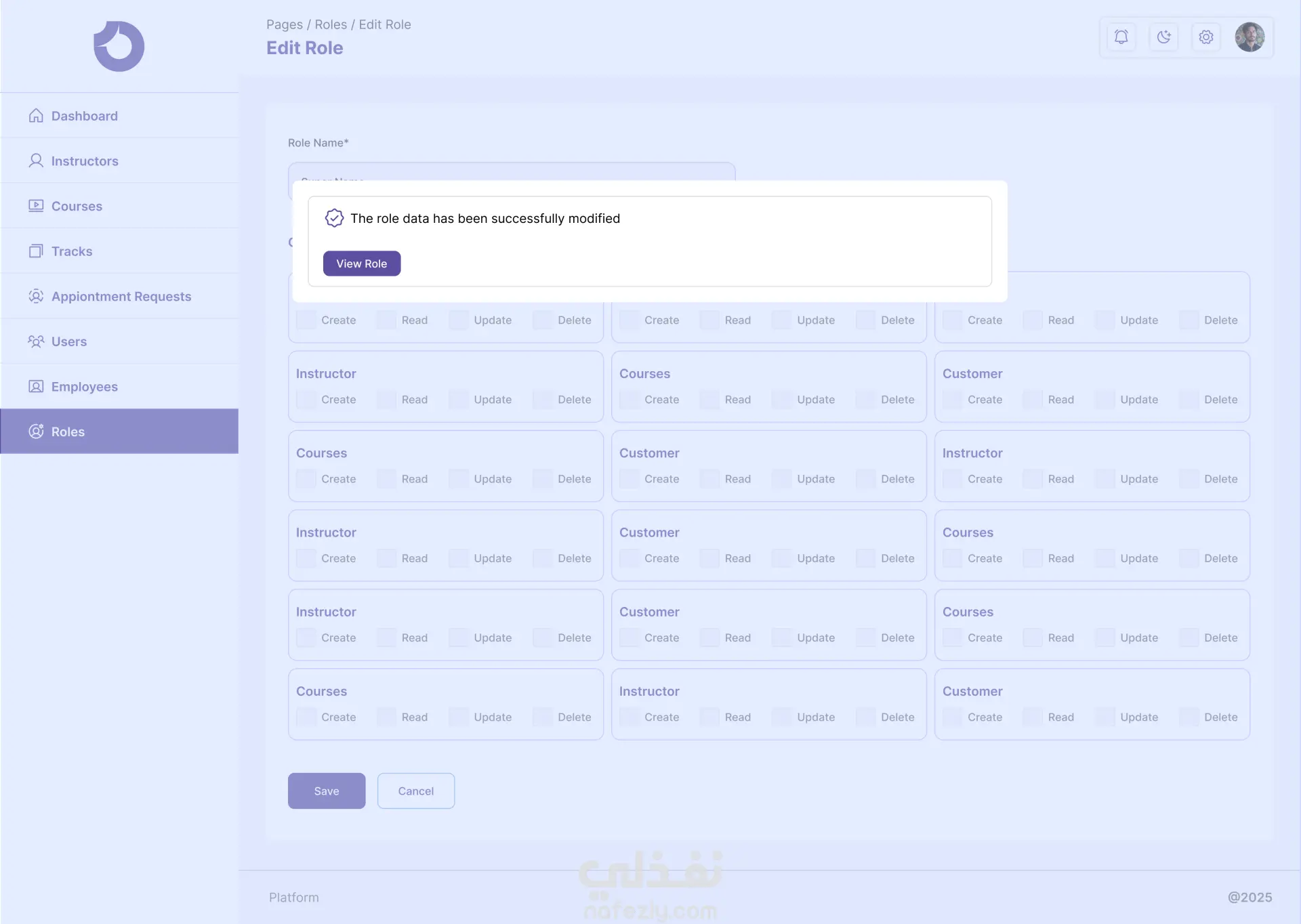 تتضمن اللوحة نظام صلاحيات مرن (Roles & Permissions) يساعد على التحكم الكامل في المهام داخل النظام.