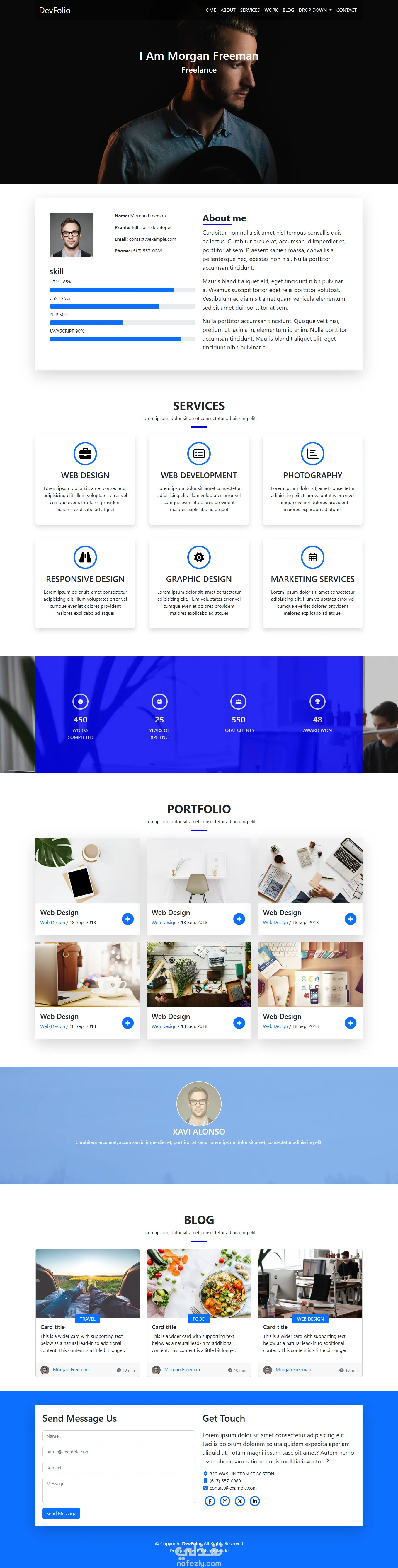 صممت موقع بورتفوليو شخصي DevFolio ليُظهر خبراتي ومهاراتي كمطور واجهات Frontend. يحتوي الموقع على أقسام مثل “About”, “Services”, “Portfolio”, “Blog”, و“Contact”، مع تصميم متجاوب وأنيق باستخدام HTML, CSS, JavaScript وBootstrap. الهدف كان أن يكون الموقع جذاب وسهل التصفح، يعكس مهاراتي في تصميم الويب وتقديم المشاريع بطريقة احترافية لعرضها للعملاء والوظائف.
