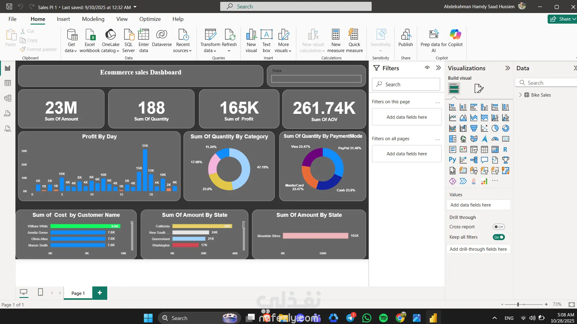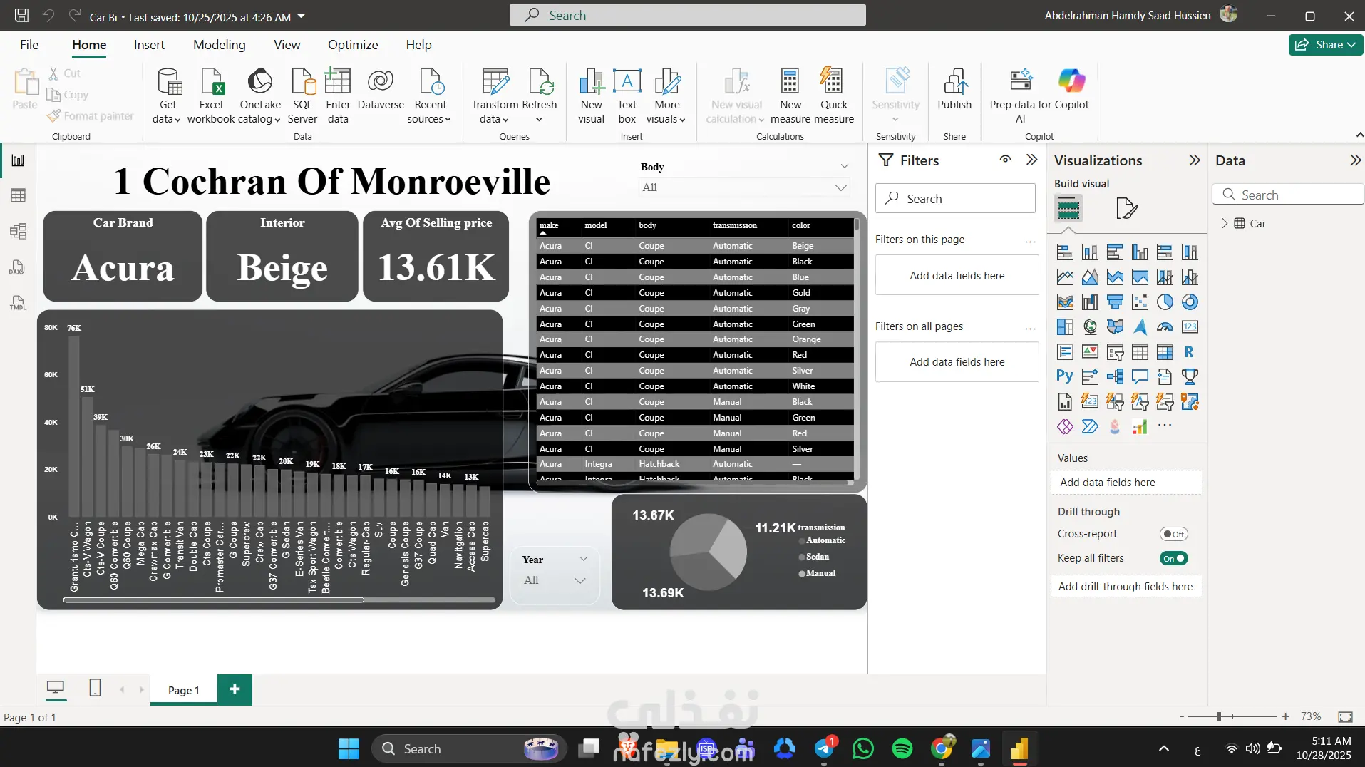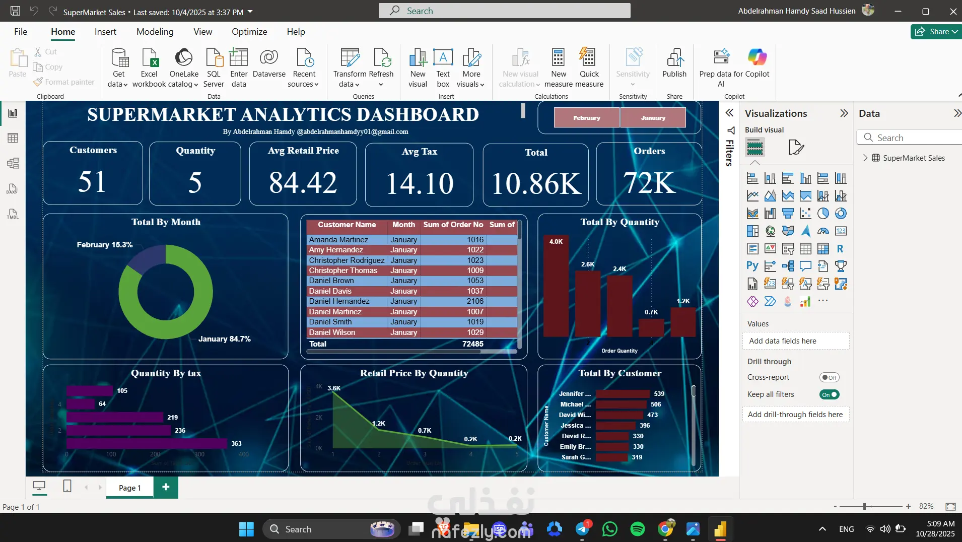 في المشروع ده صممت مجموعة Dashboards تفاعلية باستخدام Power BI لثلاث مجالات مختلفة: المبيعات – السوبرماركت – السيارات، بهدف تحويل البيانات الضخمة إلى رؤى واضحة تساعد على اتخاذ قرارات أسرع وأكثر دقة. الـ Dashboards تضمنت: Sales Dashboard: تحليل الأداء البيعي حسب الفروع، المندوبين، والمنتجات مع مؤشرات KPIs لقياس النمو والربحية. Supermarket Dashboard: عرض حركة المبيعات اليومية، تحليل المخزون، مقارنة الفروع، ومراقبة المنتجات الأكثر والأقل مبيعًا. Cars Dashboard: تحليل مبيعات السيارات حسب النوع والموديل والمنطقة، ومتابعة الأرباح والتكاليف ونسب الطلب. تم بناء النظام بالكامل باستخدام: Power Query لتنظيف وتجهيز البيانات. DAX لاحتساب المؤشرات الذكية. Interactive visuals & slicers لتصفية وتحليل البيانات بسهولة. تصميم عصري بسيط يسهل القراءة ويوضح النتائج فورًا.