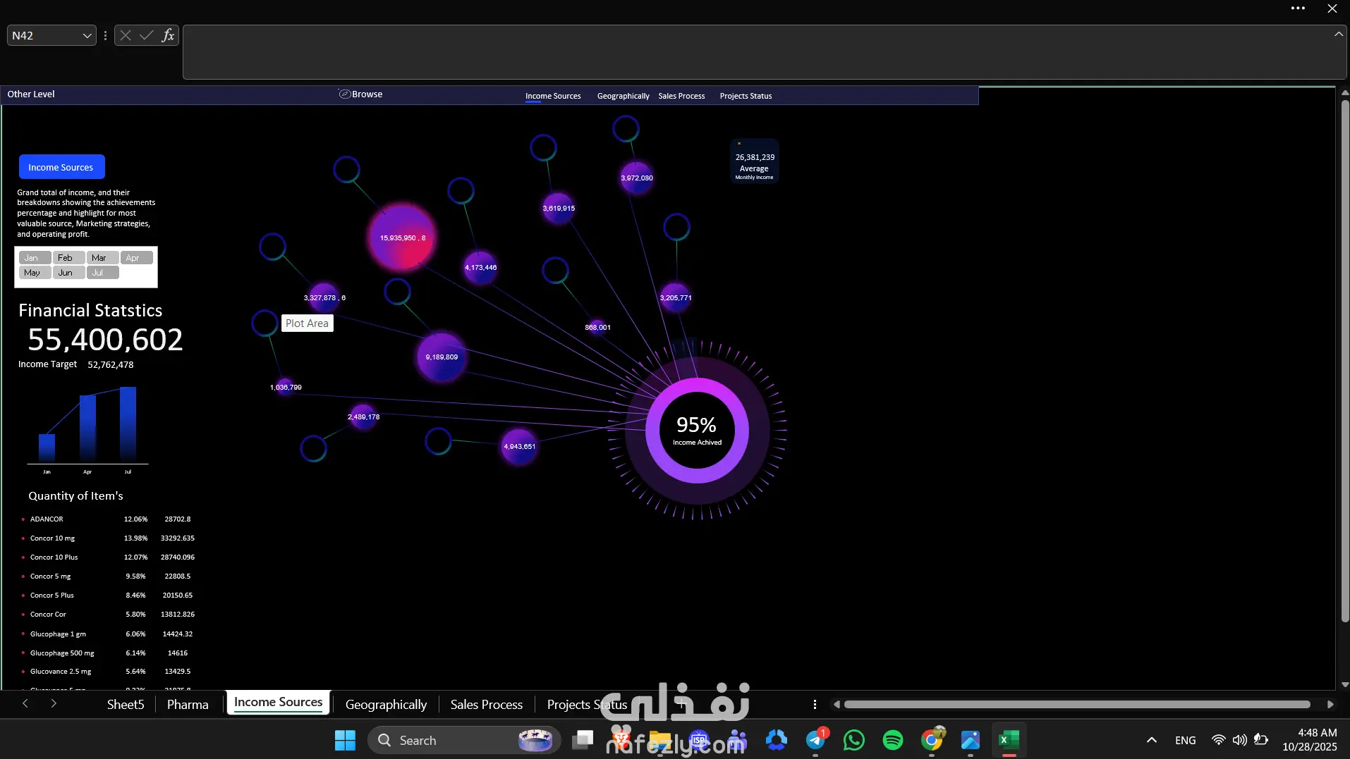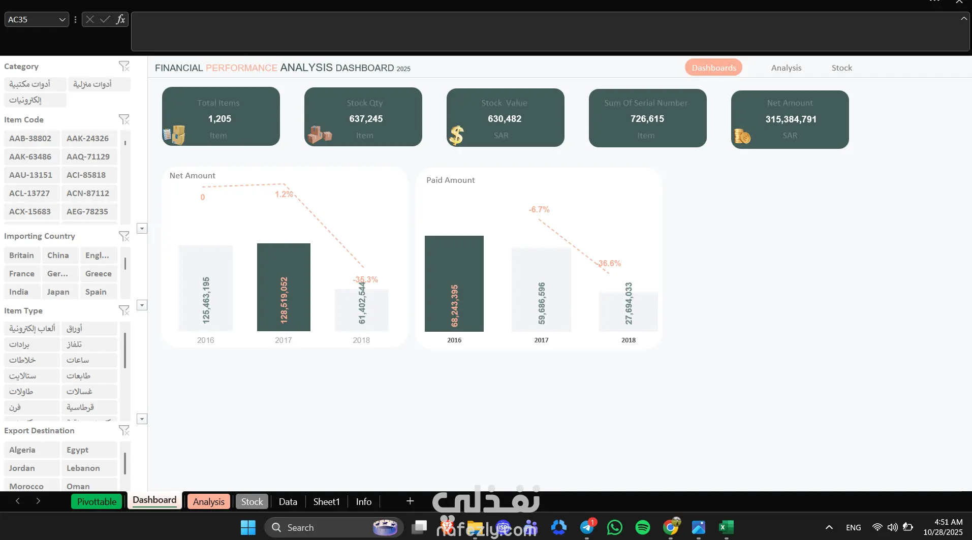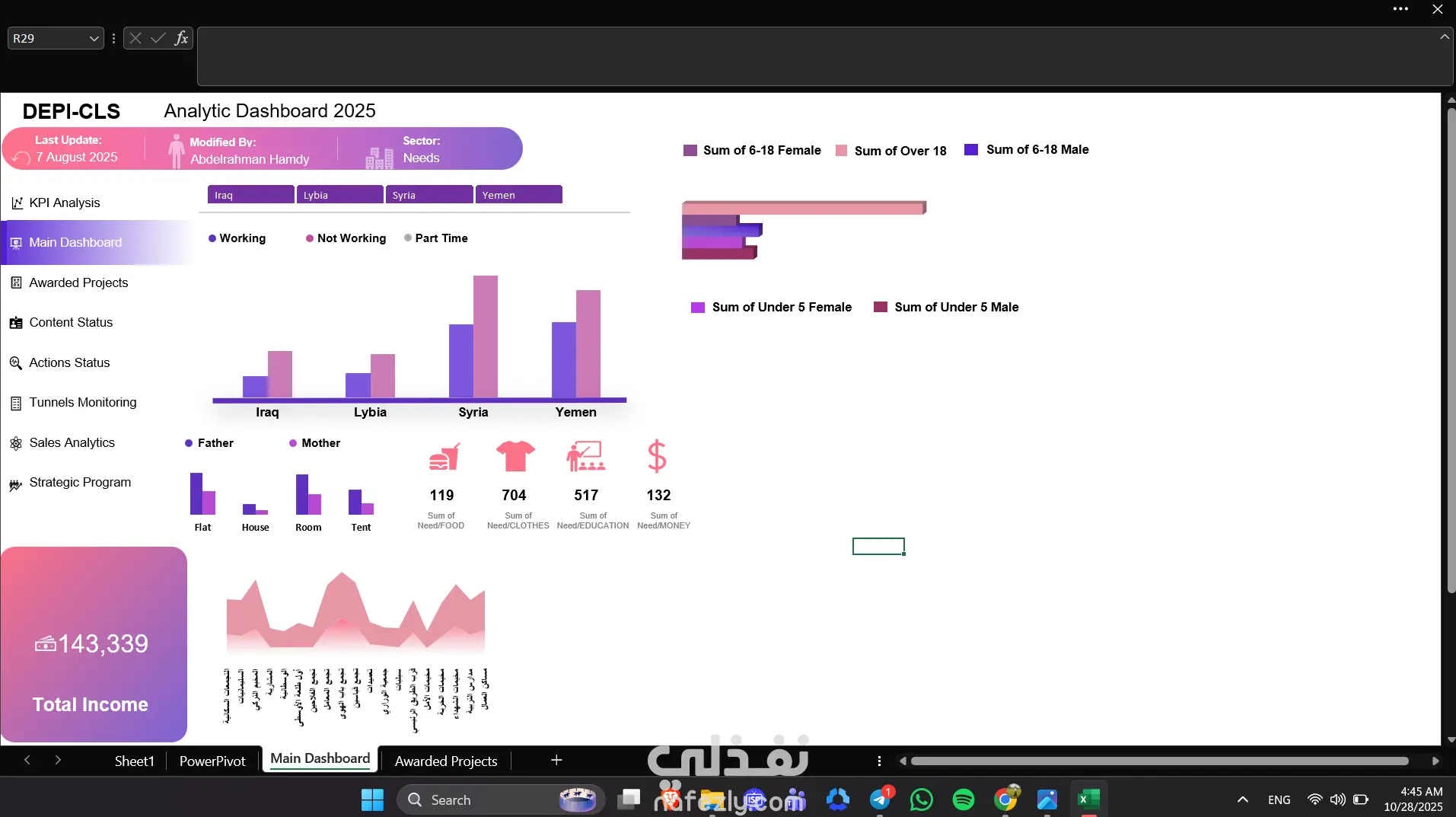في المشروع ده قمت بتصميم وتنفيذ مجموعة لوحات تحكم (Dashboards) تفاعلية باستخدام Microsoft Excel، مخصصة لعدة مجالات مختلفة، منها: قطاع الأدوية (Pharma) لتحليل المبيعات والأرباح الشهرية ومتابعة أداء المندوبين. قسم الاحتياجات (Needs) لتتبع الطلبات، وتحديد الفجوات، وتحسين إدارة الموارد. شركة العمر للاستيراد والتصدير لمراقبة حركة الصادرات والواردات، وتحليل التكاليف والعوائد. تم بناء الـDashboards باحترافية عالية باستخدام: Power Query لتنظيف وتجهيز البيانات. Pivot Tables وCharts لتحليل البيانات وعرض النتائج. أدوات تفاعلية (Slicers + Dynamic KPIs) لسهولة التصفح واتخاذ القرار. تصميم مرئي بسيط ومنظم يسهّل الفهم الفوري للبيانات.