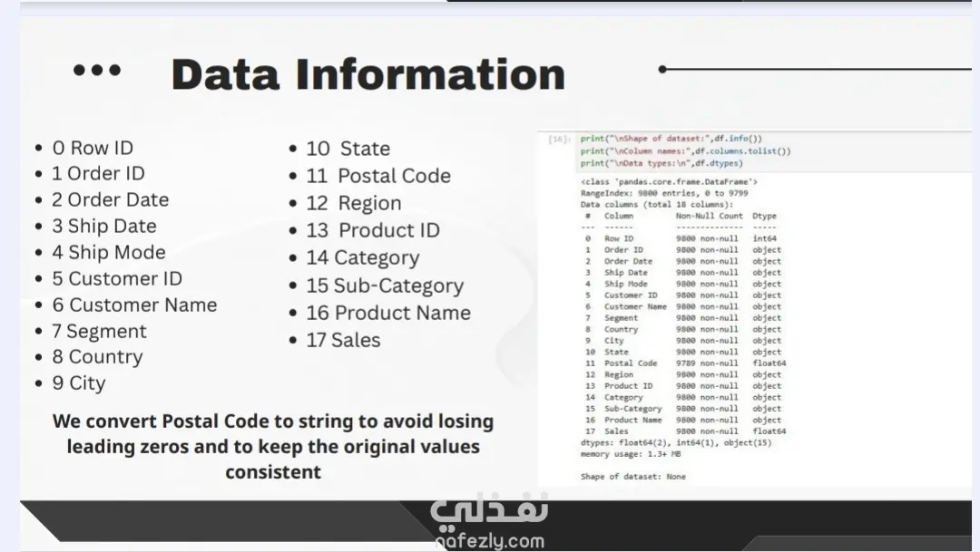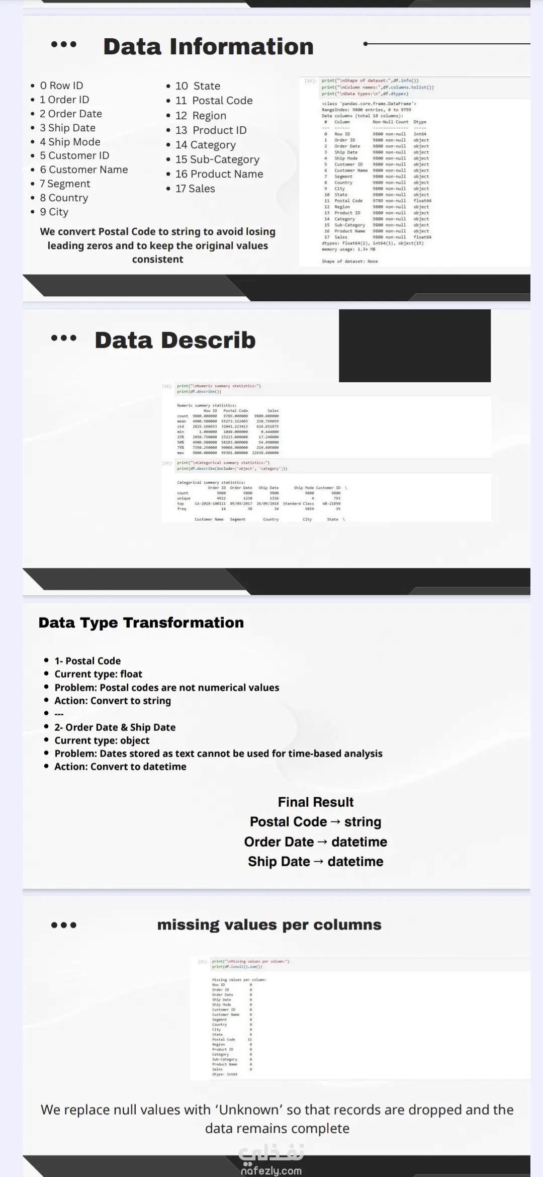 1. Data Information يحتوي هذا الجزء على نظرة عامة حول أعمدة البيانات الأساسية الموجودة في الجدول. يتضمن الجدول 18 عمودًا تمثل معلومات الطلبات، العملاء، المنتجات، والمبيعات. من أبرز الأعمدة: Order Date و Ship Date: تواريخ الطلب والشحن Customer ID و Customer Name: بيانات العملاء Product ID و Product Name: تفاصيل المنتجات Sales: قيمة المبيعات Postal Code: الرمز البريدي Region / State / City / Country: مواقع جغرافية > تمت ملاحظة أن عمود Postal Code تم تحويله إلى نوع string بدلًا من float، وذلك لتجنب فقدان الأصفار في البداية (leading zeros) والحفاظ على القيم الأصلية كما هي. --- 2. Data Description في هذا القسم تم تحليل البيانات رقميًا وفئويًا باستخدام دوال مثل describe() في بايثون. تم عرض إحصائيات وصفية للأعمدة الرقمية (مثل الحد الأدنى، المتوسط، والانحراف المعياري)، وكذلك تم استعراض الإحصاءات الفئوية للأعمدة النصية (مثل عدد الفئات المميزة وأشهر القيم). --- 3. Data Type Transformation أثناء تحليل أنواع البيانات، تم اكتشاف بعض المشكلات في أنواع الأعمدة: 🔹 Postal Code النوع الحالي: float المشكلة: الرموز البريدية ليست قيمًا رقمية فعلية (مثل 02139). الإجراء: تحويلها إلى string للحفاظ على الصيغة الأصلية. 🔹 Order Date و Ship Date النوع الحالي: object (نص) المشكلة: التواريخ المخزنة كنصوص لا يمكن استخدامها في التحليلات الزمنية أو الفترات. الإجراء: تحويلها إلى datetime لتمكين التحليل الزمني (مثل حساب مدة الشحن). 📌 النتيجة النهائية بعد التحويلات: Postal Code → string Order Date → datetime Ship Date → datetime --- 4. Missing Values Per Columns تم تنفيذ فحص للقيم المفقودة (Null Values) في كل عمود داخل الجدول. بعد مراجعة النتائج، تم اتخاذ القرار التالي: > ✅ الإجراء: استبدال القيم الفارغة بـ “Unknown” وذلك لتفادي حذف السجلات وضمان بقاء البيانات مكتملة وقابلة للتحليل. بهذه الطريقة يتم الاحتفاظ بكل السجلات في مجموعة البيانات دون فقد أي صفوف. --- 💡 Summary بشكل عام، تم تنفيذ الخطوات التالية ضمن مرحلة Data Cleaning & Preparation: 1. فحص هيكل البيانات وأنواع الأعمدة. 2. تحويل الأنواع الخاطئة (مثل الرموز البريدية والتواريخ). 3. معالجة القيم المفقودة بشكل يحافظ على اكتمال البيانات. 4. تجهيز الجدول بشكل مثالي لعمليات التحليل والاستكشاف اللاحقة.