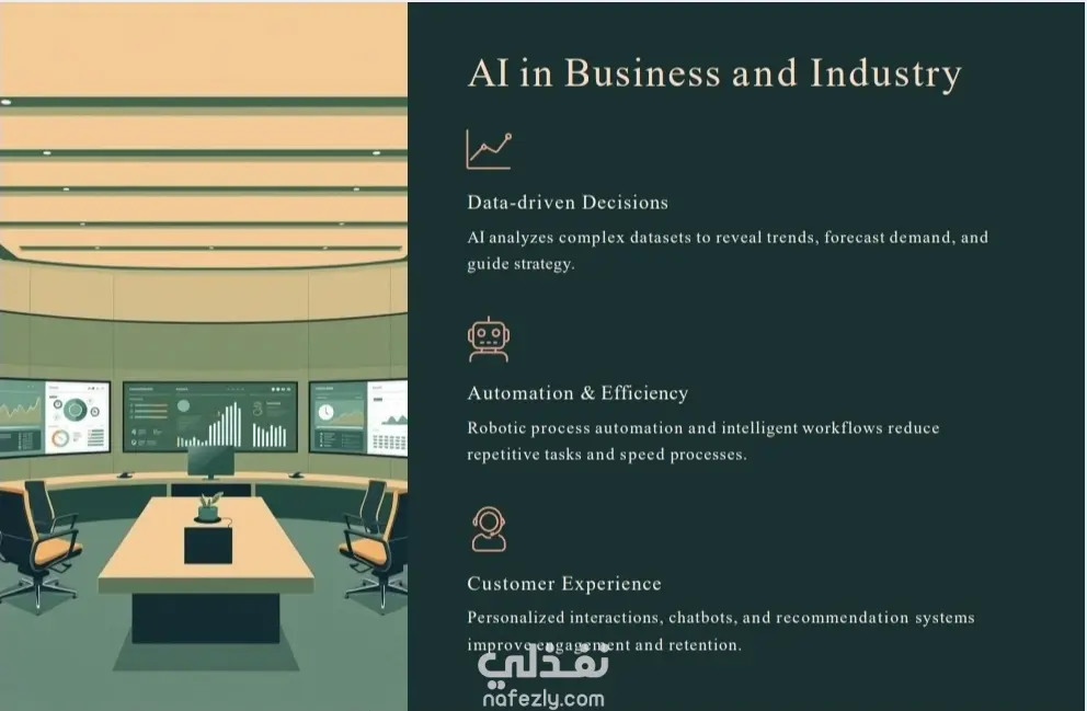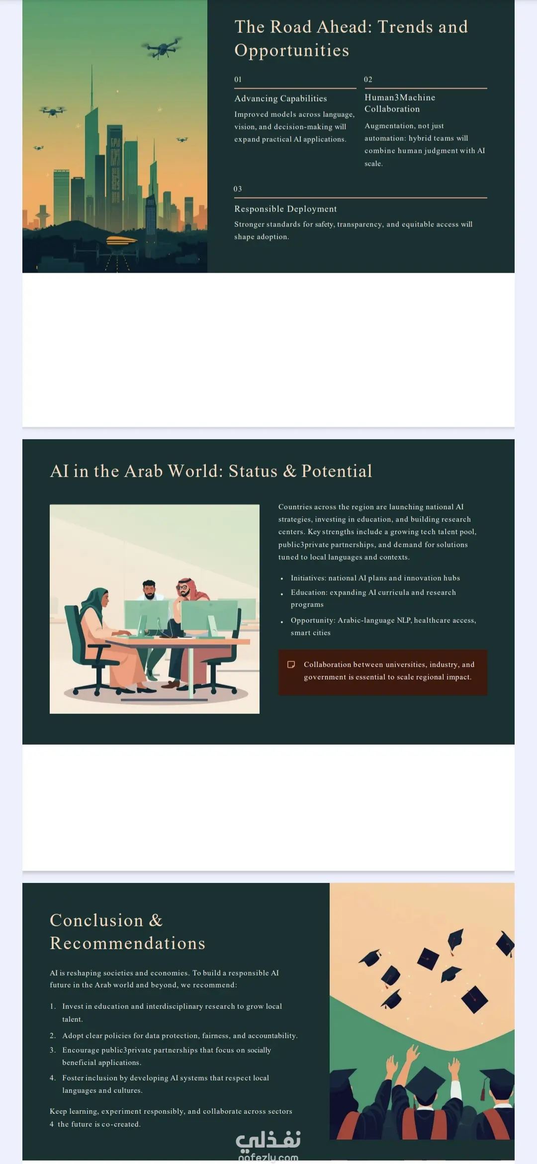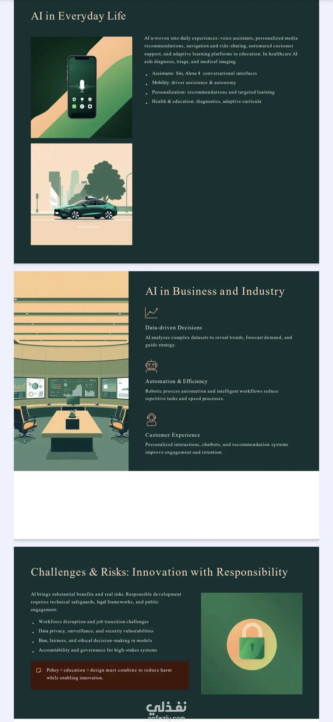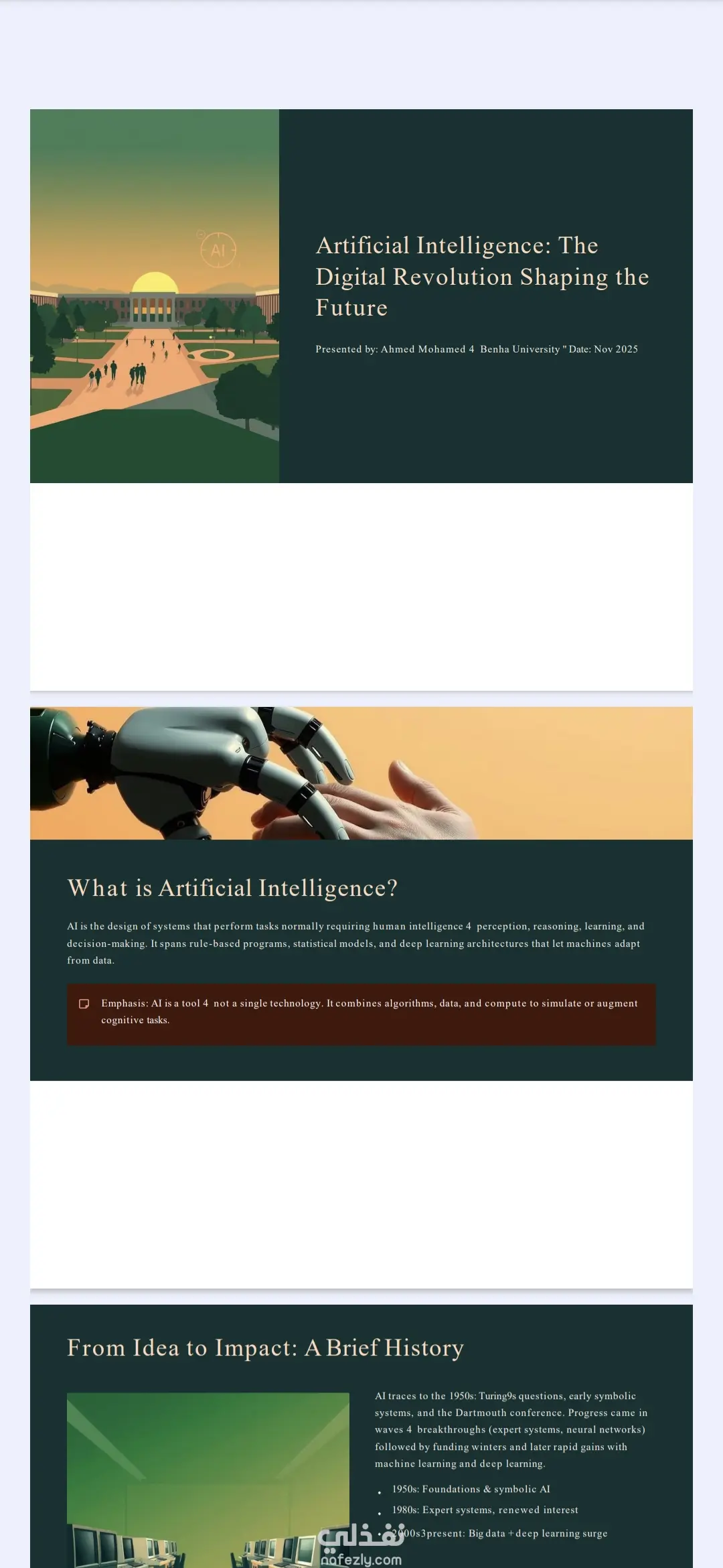 العمل عبارة عن عرض تقديمي شامل يتناول موضوع الذكاء الاصطناعي باعتباره أحد أهم الثورات الرقمية في العصر الحديث، موضحًا كيف يغيّر هذا المجال مستقبل البشرية في التعليم، الصناعة، والحياة اليومية. يبدأ العرض بتعريف الذكاء الاصطناعي وشرح تاريخه وتطوره عبر العقود، ثم يستعرض أنواعه ومستوياته مثل الذكاء الاصطناعي الضيق والعام والخارق. كما يوضح التطبيقات العملية في مجالات الحياة اليومية والأعمال التجارية، مبينًا دوره في تحسين الكفاءة واتخاذ القرارات وتعزيز تجربة المستخدم. يتناول العمل أيضًا التحديات والمخاطر المرتبطة بالذكاء الاصطناعي مثل فقدان الوظائف، قضايا الخصوصية، والتحيز في النماذج، مع التركيز على أهمية التطوير المسؤول والحوكمة الأخلاقية. كما يسلط الضوء على وضع الذكاء الاصطناعي في المنطقة العربية من حيث المبادرات، التعليم، والفرص المستقبلية. ويختتم العرض برؤية للمستقبل وتوصيات لتحقيق توازن بين الابتكار والمسؤولية من خلال التعليم، السياسات العادلة، والتعاون بين القطاعات المختلفة.